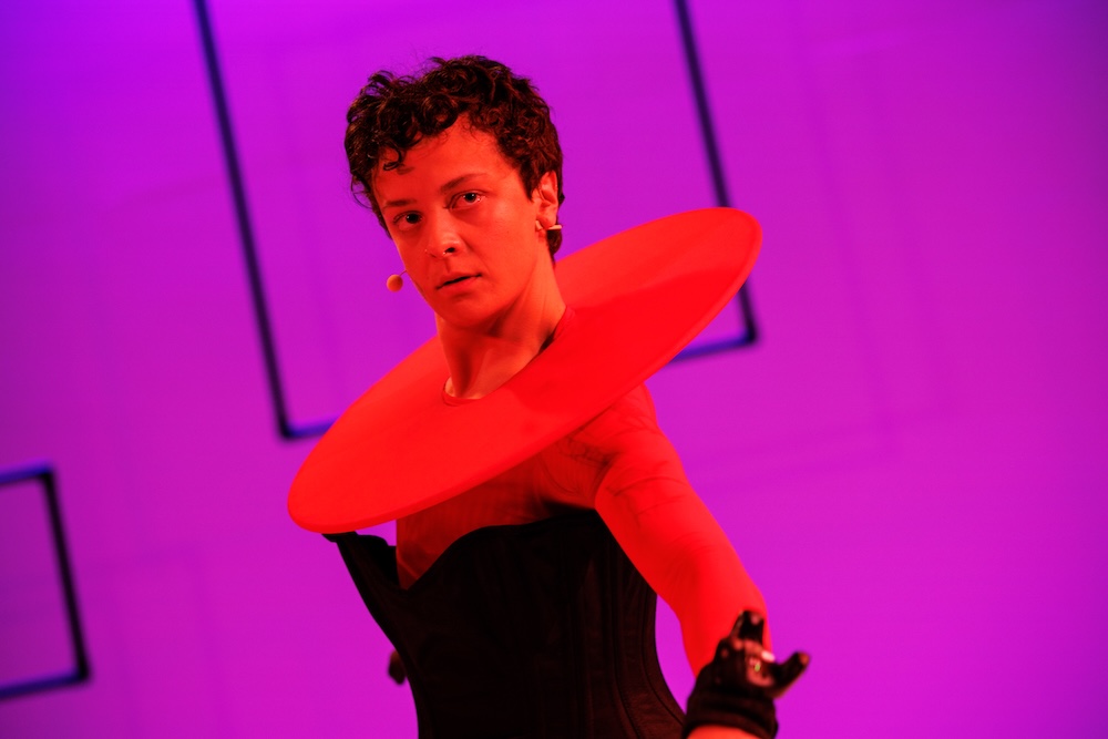 As Duval’s notes pierce the room, dancers Felix Bryan, Lo Poppy, and Jonathan Colafrancesco execute abrupt, awkward movements that fuse familiar hand gestures such as peace signs and pointing with uncontrollable tics. The sensation is undeniably strange, and some may find it uncomfortable when the dancers deliberately stare at us. The dancers move like roaming robotic agents, accompanying Duval as she steps into her position as main character.