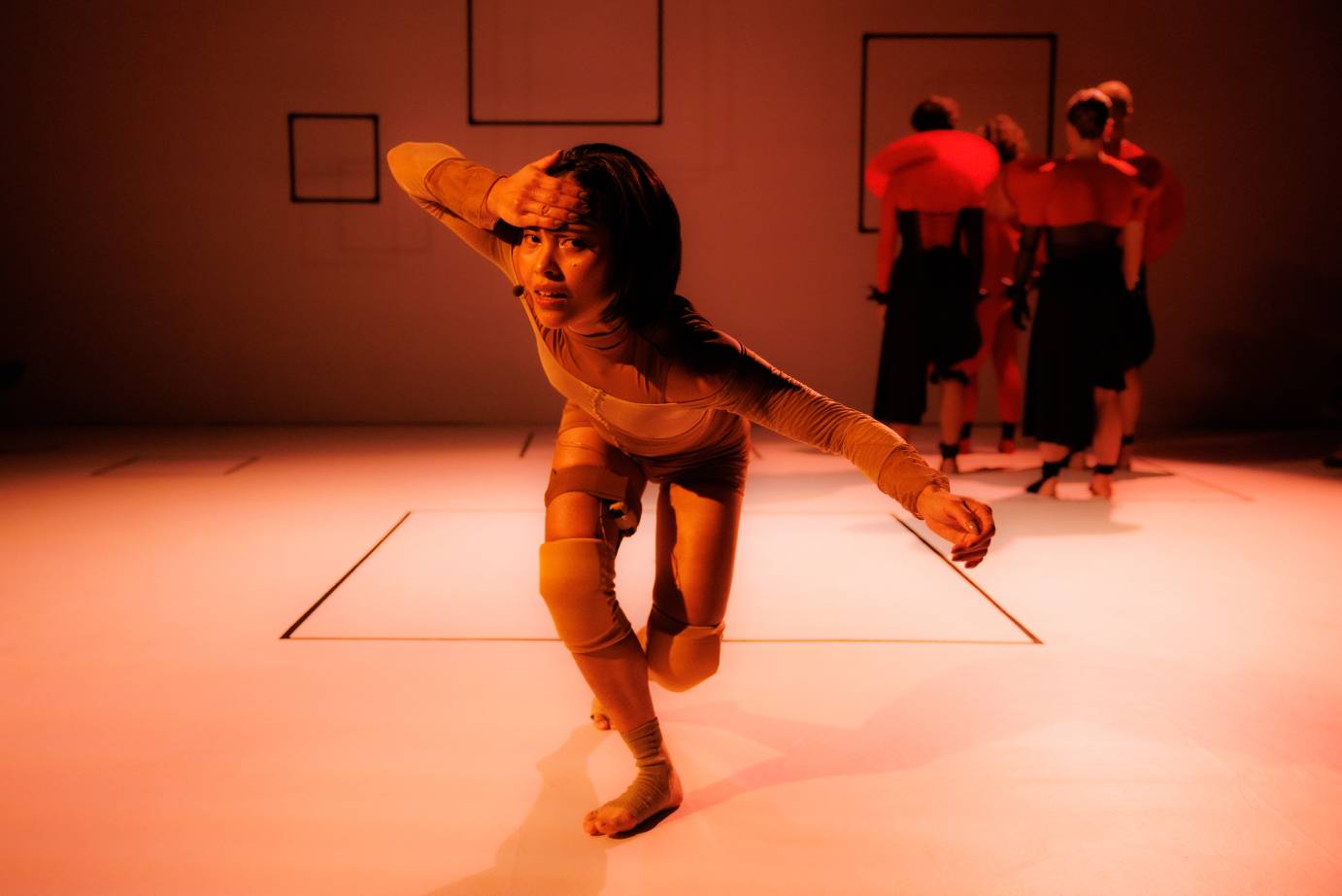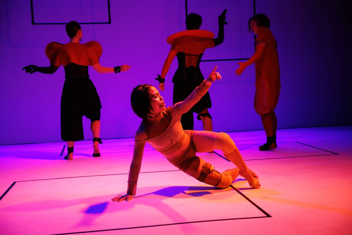 “Am I hurt?” asks Marie Lloyd Paspe, curled on the floor in flesh-toned garments and kneepads. Paspe is confined to one of the ten black-taped squares placed on the back wall and floor. She splays her spine, jutting herself off balance while executing quirky floorwork that crumples and extends in a heartbeat. Her trust in gravity is impressive as she continues to speak, peering out to the audience for support. She reflects, “A better question to ask is, how am I hurt?”