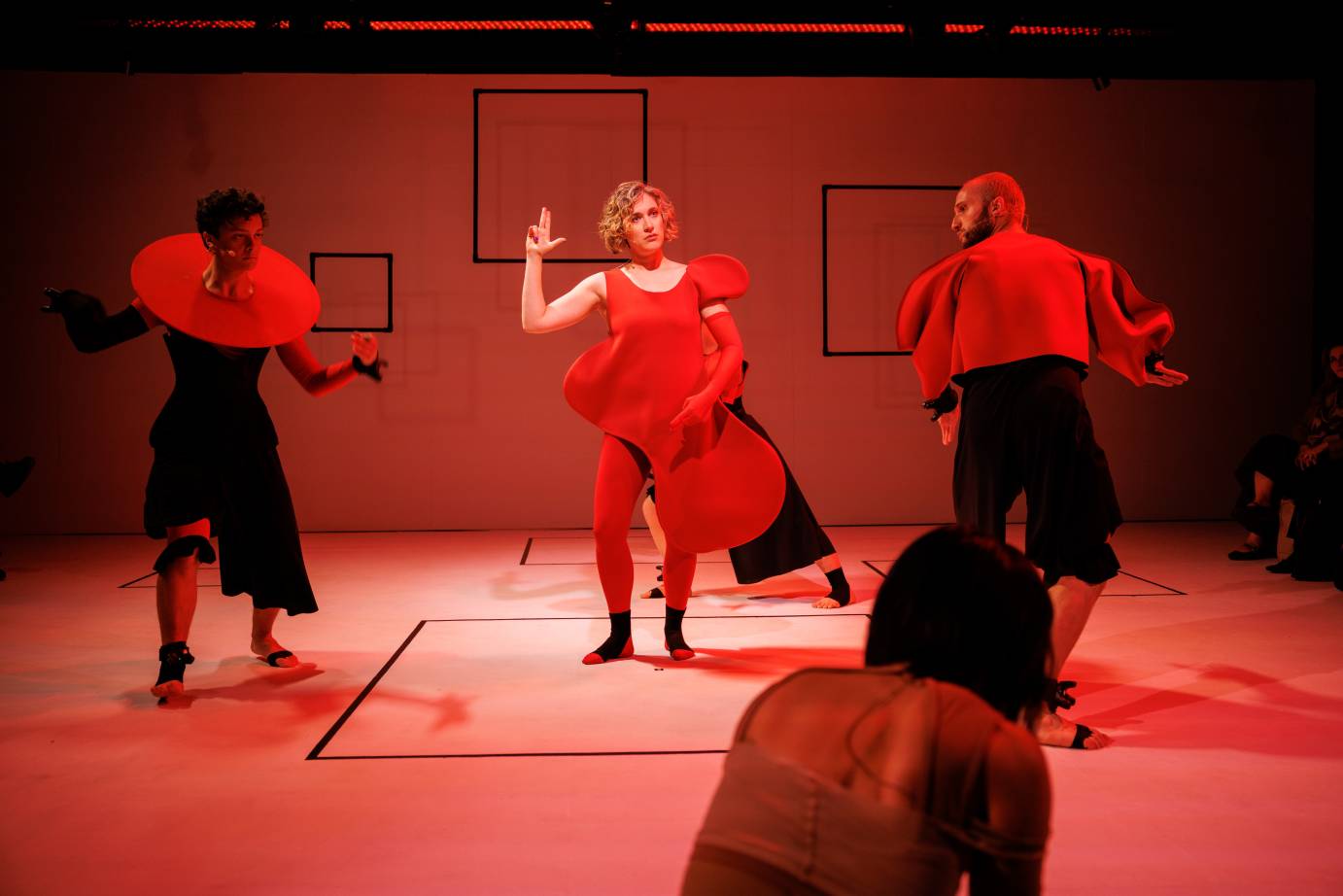 During this solo, four figures dressed in piercing red and black loom in the corner, facing away from us. When a gigantic booming noise interferes with Paspe’s solo, all four turn around, revealing three dancers and opera singer Rocky Duval. Paulina Olivares’s exquisitely precise costume design transforms the dancers into works of art, their bodies wrapped in black mesh and corsets layered with structured cropped jackets, boleros, and outerwear. Duval, who appears in a one-shouldered garment and glove, is dressed head to toe in red. She begins singing with calm confidence, maintaining eye contact with all members of the audience as Kamala Sankaram’s crackling sound score underlies her vibrato.