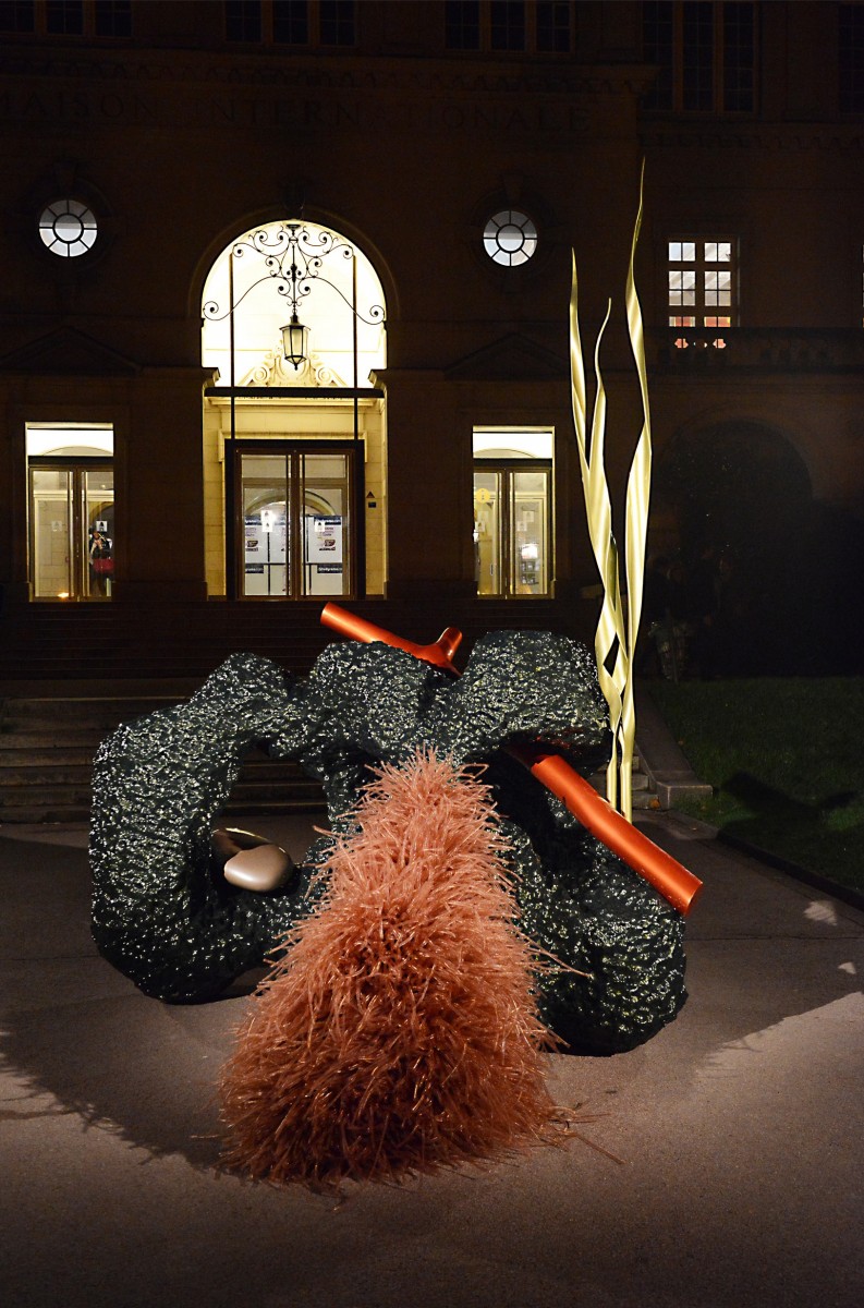 The performative installation, Abysse, by the dance-visual arts team Sylvain Prunenec and Clédat & Petitpierre, was on exhibit in the theatre lobby on my first visit, and in front of the theatre entrance on my second. Prunenec was immersed in a brown-orange fabric of filaments, and nested in a black stand-alone sculpture. Even the smallest of movements, a simple breath, sent the tentacles a-wave. He seemed like a sea anemone in the ocean, but that was all. As a performance work it just didn’t hold up.