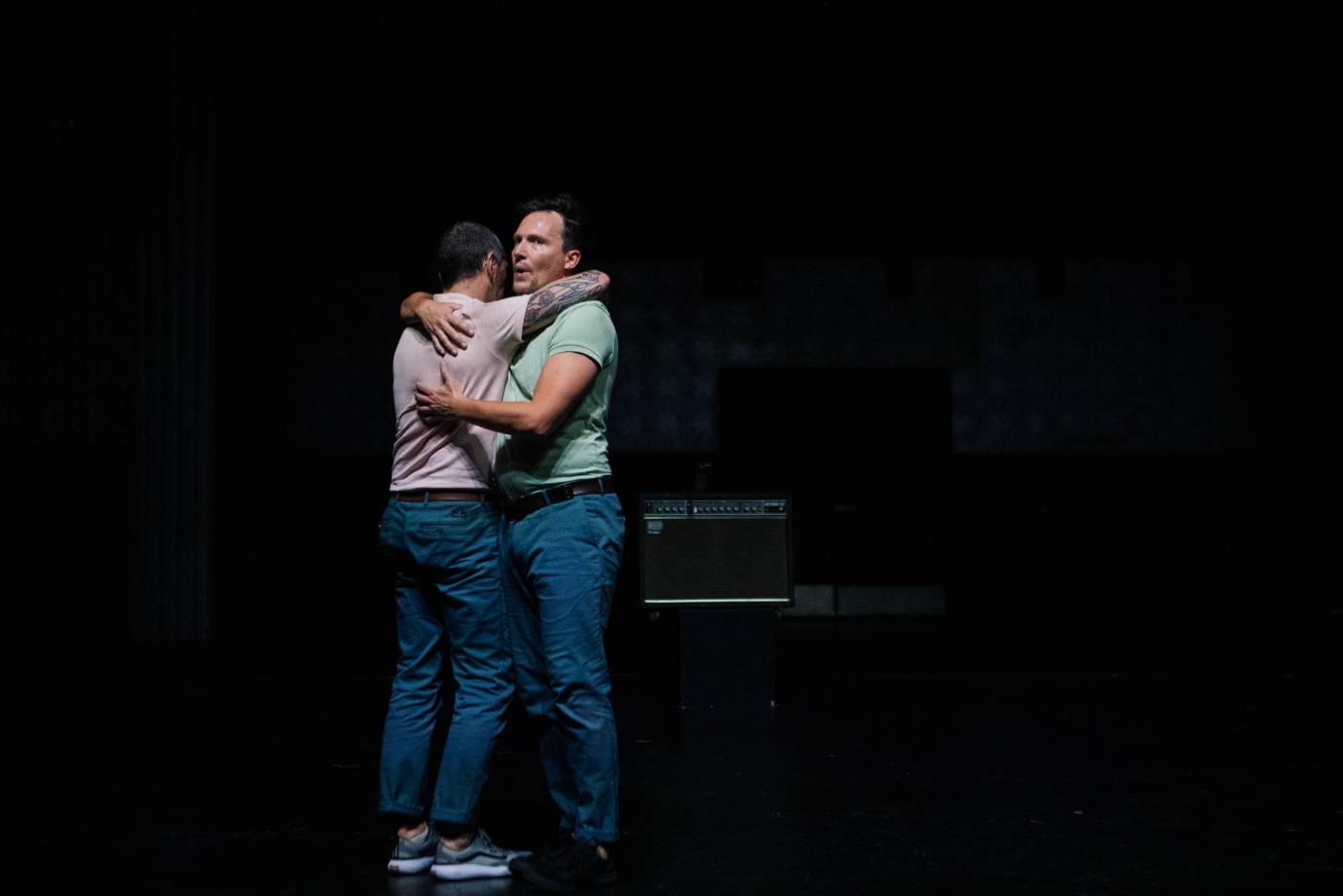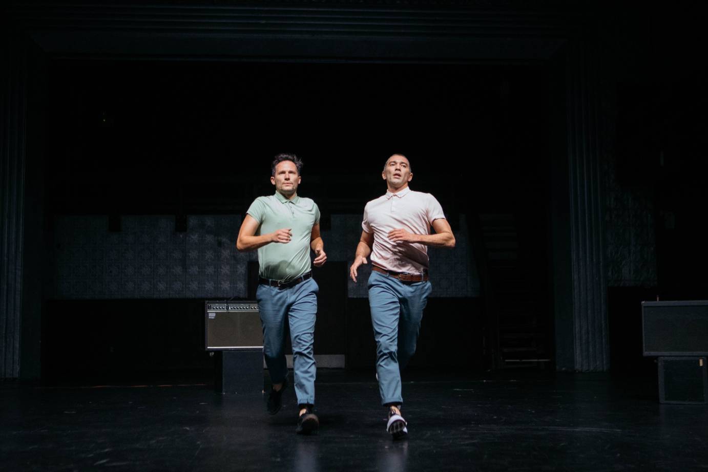 Opening with the Rolling Stones, heard on three large speakers-as-set, the lusty sound bounces from one speaker to the next. As in the 80s, parts of the song stick and repeat like a needle on a vinyl record. The casually dressed performers face one another (one senses that they enjoy a casual yet fierce friendship). In slow motion they bend to the extreme, one forward, the other back as a segment of Wild Thing by The Doors, plays. Sneakers squeak as the dancers run past one another on the diagonal, spliced with bits of phrases that include rolls, a turn with a whipping leg, deep lunges and hops. After full out running, clapping hands as they pass one another, they collapse and experience brief respites. At the end of a long passage of walks, each on different counts, Chen wraps his arm around the neck of Monty.