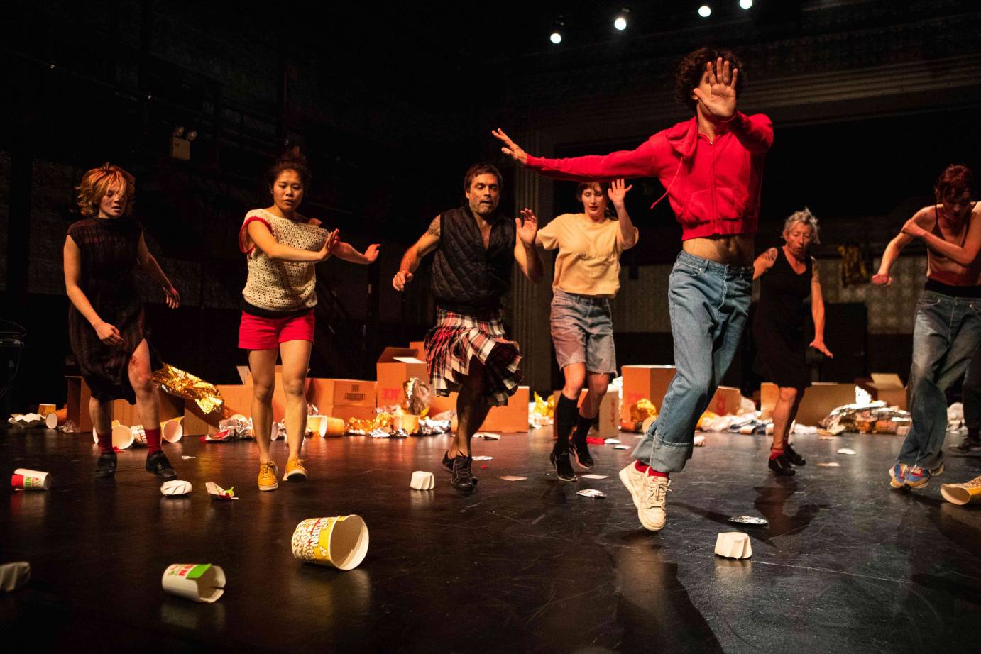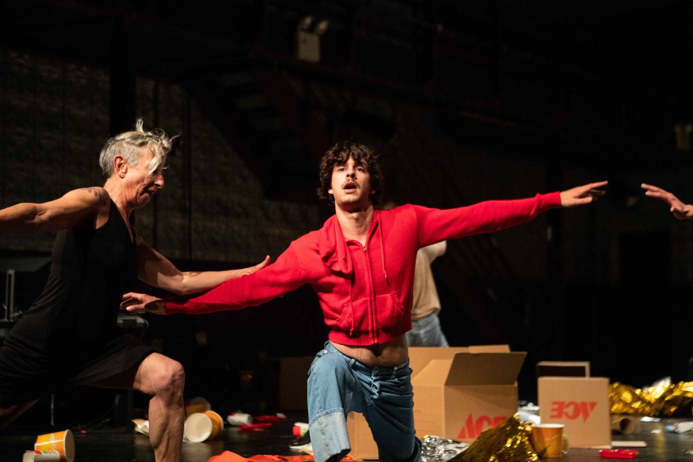 The opening night performance of the sprawling 75-minute Unisson greets the audience with a magical and messy set of large cardboard boxes, paper cups, gold and silver crinkly warming blankets, and sheets of paper strewn across the floor. Partnerships, solos and groupings dissolve and reform both slowly and quickly, and with abandon and with definition. Noted were loose unison and circular phrases (the dancers studied numerous global social dances from which to develop movement), knees to chest while hopping, and nearly constant running around the stage’s perimeter. When crumpling from fatigue, the performers lean on one another in reliance. They call out numbers in French and English, and sing The Doors’ Waiting for the Sun off-key. This dizzying but beautiful spectacle, a social dance for current times, is accompanied by cellist, DJ, and composer Pierre Le Bourgeois and lighting designer, Eric Wurtz, visibly situated on either side of the stage. The cello squeals and groans. Lights bathe the stage in red.