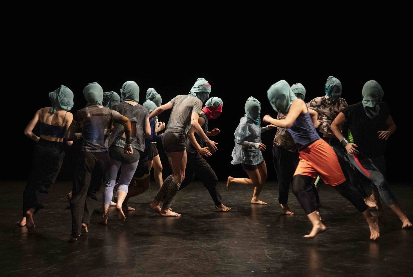 The faces of the all-female NYU cast plus Compagnie Kashyl women dancers are covered in Distances, to bring attention to the body and the body's unabashed desire to move in fantastic ways. Though less successful than the other dances, the committed performers reiterate Chen’s choreographic methods by singing songs such as Carol King's So Far Away and nursery rhymes while running, grouping, supporting, and abandoning. Several concurrent scenes, like a woman perched on the back of another lying face down on the floor, superimposed with other scenes, creates a prismatic, roiling impact.