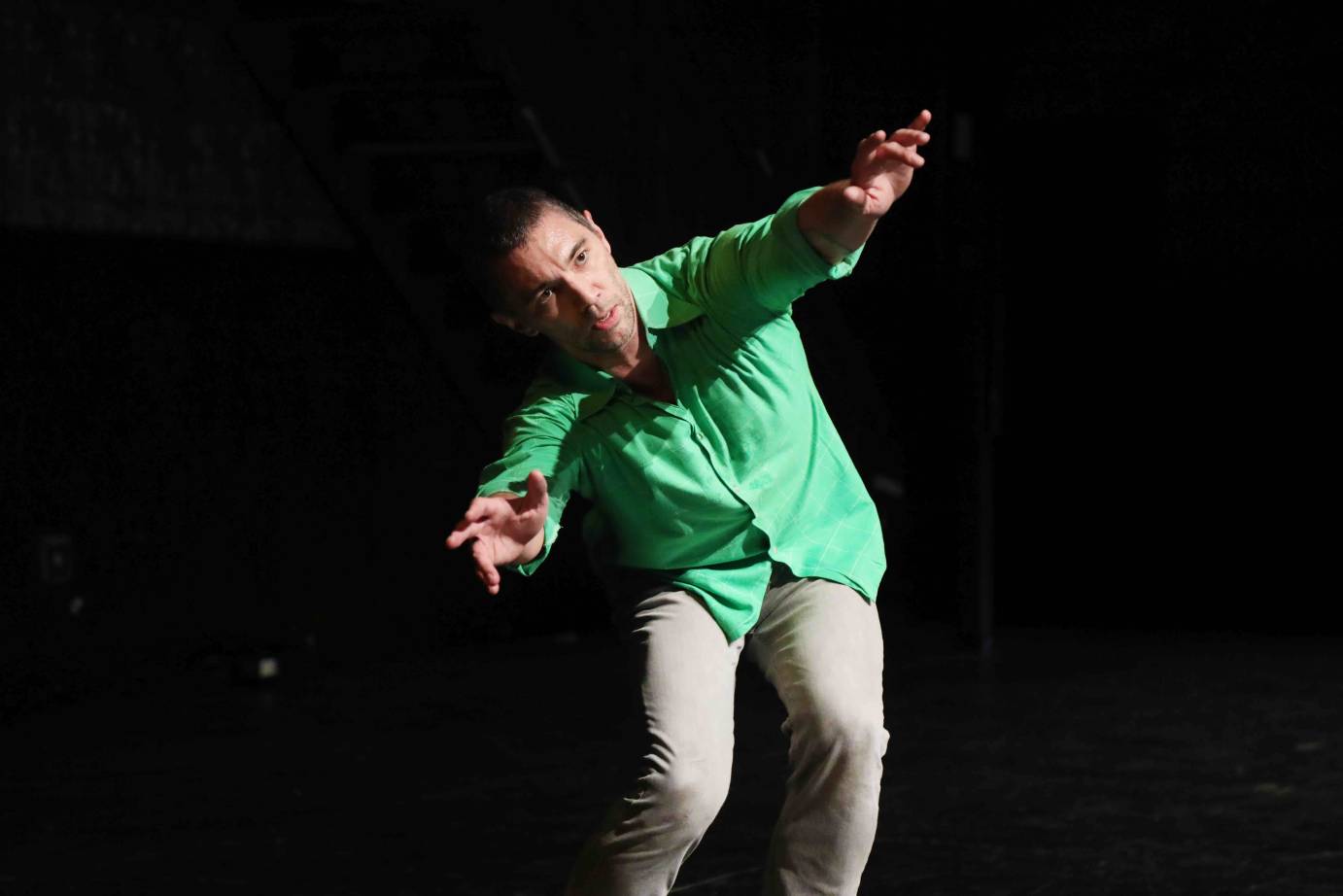 Chen, in TUMBLE, a splendid and accomplished dancer, carves etched phrases. Elegant, weighted and off-center, Chen rebounds from lofty tosses and folds to the floor. In lime green shirt and khaki pants, Chen, while dancing, recounts his life as a performer from youngster to his years with MCDC, and with other notable choreographers, as well as, his own life as a creator.