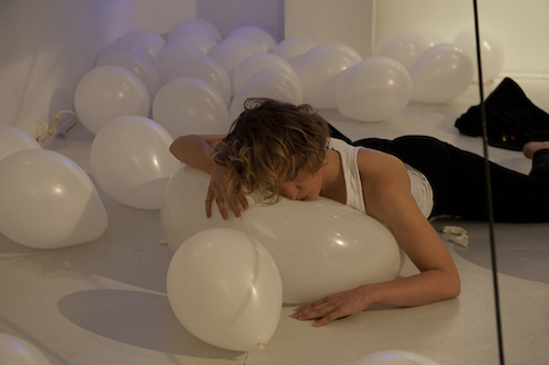 The premiere of Christina Towle's AIRTIGHT begins with the sound of her breath as she blows up a very large white balloon. She fills it completely -- you can't help but wonder if it will pop -- and when she is done, she lets it go. We see it, hear it and feel it expire as the air leaves. All of that breath becoming nothing but the limp shell of the thing-- death and the life that was.