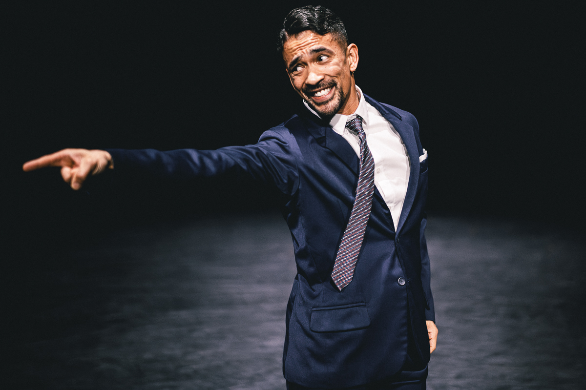 In crisp contrast, a fast-talking climate denier, played by Jon Bond, dazzles with firecracker footwork, spit-sharp pivots, exaggerated gestures and an eerily jerking head that woggles like it is not fully connected to his body. A gullible crowd surrounds him as he lip-synchs a glib sermon on the values of a free-market economy and the individual liberties that justify his refusal to care about anyone or anything other than himself.
