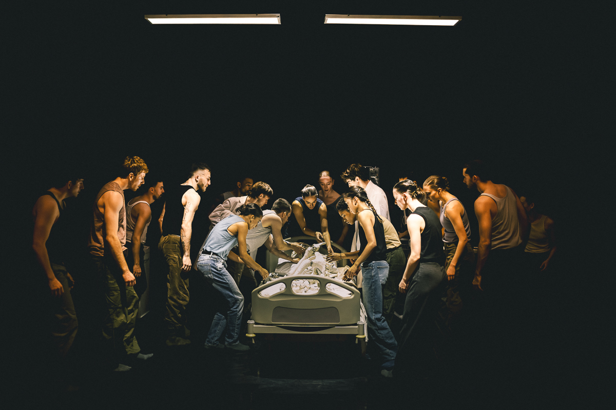 Most of this section, however, takes place in a hospital room. The soft purple light glowing above a dying woman’s bed expands and shrinks with the sound of her breath, like the pulse of her soul. Family members gather with trepidation, orderlies change sheets irreverently. A voice narrates the five stages of decomposition as the company snaps in a jazzy kick-ball-change sequence. By the time we get to the fifth stage, skeletonization, the bones of the Asiatic Cheetah have replaced the dying woman.