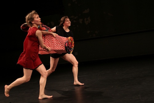This collage begins as playful duet that develops from minimal effort to wild exuberance. Two women (one of whom is the choreographer) in different colored dresses circle each other, twirling and leaping. Mischief ensues as the women exit then return carrying bright blue pillows. Like children at a sleepover, they explore the possibilities of their exciting props, tossing the pillows around the stage and at each other. The shenanigans result in a dizzying play-fight, finding the women alternatively dumping water on each other then shampooing their hair.