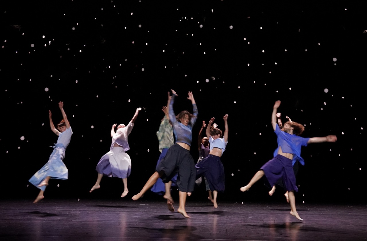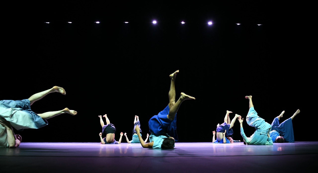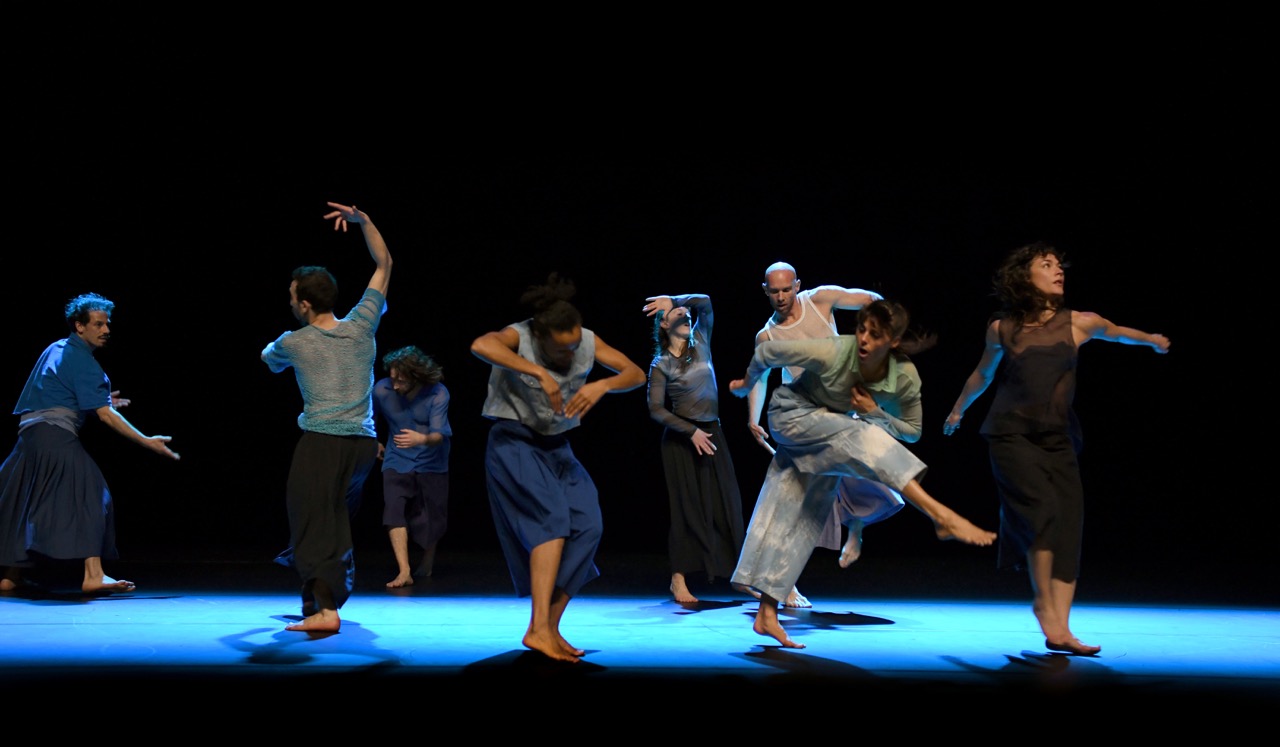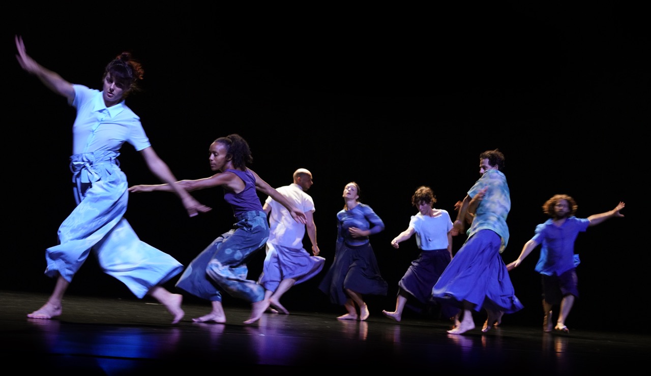 Eight extraordinary dancers are swept up in the current, gliding smoothly one after the next on feet that patter sideways, backward and forward. They trace a repeating infinity sign in space. Gathering into a group huddle, they leave one dancer, then another standing in stillness for a moment. Yet the overall flow never stops. Jumping lightly, the dancers reach, suspend and thrust. Legs, arms and torsos swirl. Their bodies create images of waves splashing, or the heft of water heaving in a storm.