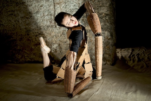 Noro appears - half in darkness, half in light- casting shadows in the distance. She seems like a giant insect with feet en pointe and arms inserted into the sleeves of, what look like, beautiful bamboo crutches.body is encased in a dress of wooden squares that are linked together loosely. They flap and clack as she moves. When we follow her deeper, through the building's small chambers and odorless arches, we are allowed to sit down:our coats are still firmly clutched around us.