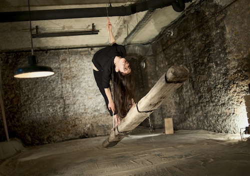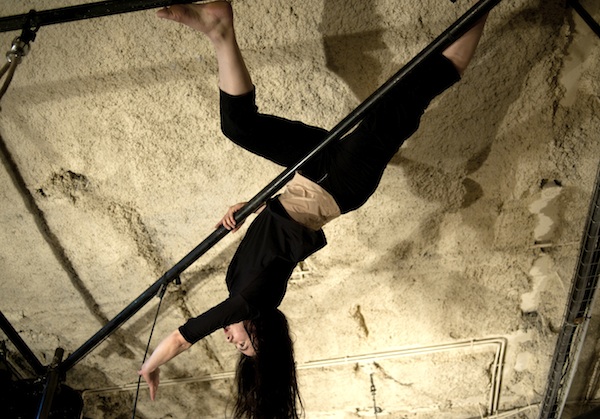 I zone in and out as the piece progresses.The visual beauty of such a rugged space, and Noro’s smooth ability as an acrobat intrigue me. I wonder how, or why, she is willing to do four performances in a row in a space this cold, and on a floor that is - despite the huge swath of muslin covering it - hard, broken, uneven concrete.