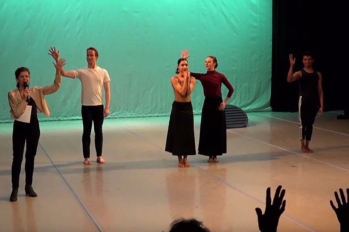 (L-R) Virginie Mécène, Esteban Santamaria, Ghislaine van den Heuvel, Lauryn Rickman and Gion Treichler demonstrating dance moves from Appalachian Spring. Photo: Screen capture from live stream of Studio Series on December 12, 2021.