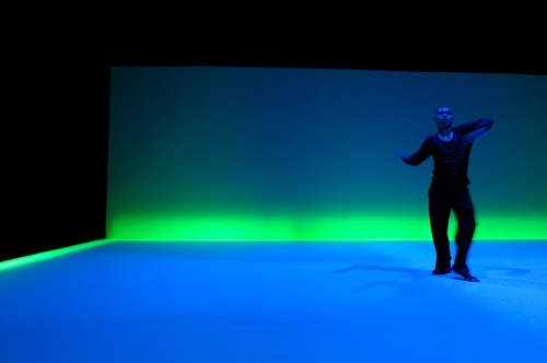 When Umeda starts Haptic , a solitary body in loose black clothes stands still in one spot upper stage right. With his feet glued to the floor, we sit ready for an outbreak of flow and vigor. But the artist rarely takes any steps, generally doesn't move from his spot, always faces the front and certainly shares no virtuosic jumps or turns. Instead, a tension builds which very slowly turns into an all encompassing quiver on one side of Umeda's body:his right arm and leg and jolt out in isolations that continue throughout the piece. These small random movements are reminiscent of a robot firing up and then powering down.