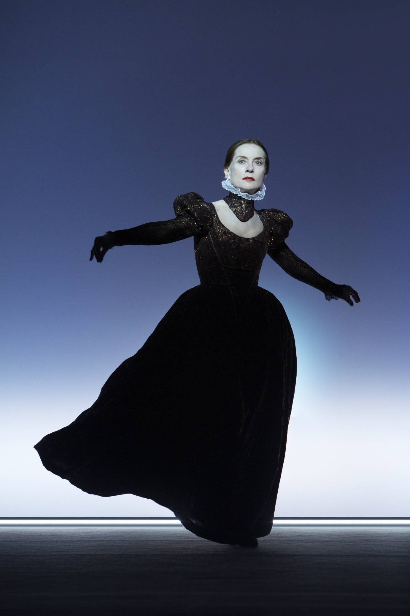 In this airy production built out of light, with incidental music by Ludovico Einaudi, and text by Darryl Pinckney, Huppert freezes or moves mechanically, while the non-linear plot advances in fits and starts. She speaks to us directly or in voice-overs, further fragmenting the narrative. Repeating certain passages from the text, Mary reveals her obsessions while the words drill into our heads. She recalls the companions of her childhood, four maids-of-honor all named Mary, and Diane de Poitiers, the royal mistress who taught her life’s graces. Marriage to the Dauphin made her the Queen of France---briefly, as the timid youth died a year later. She tells us she did not know that thousands of her Scottish subjects perished for the sake of this alliance, victims of an English invasion. She would learn many brutal facts.