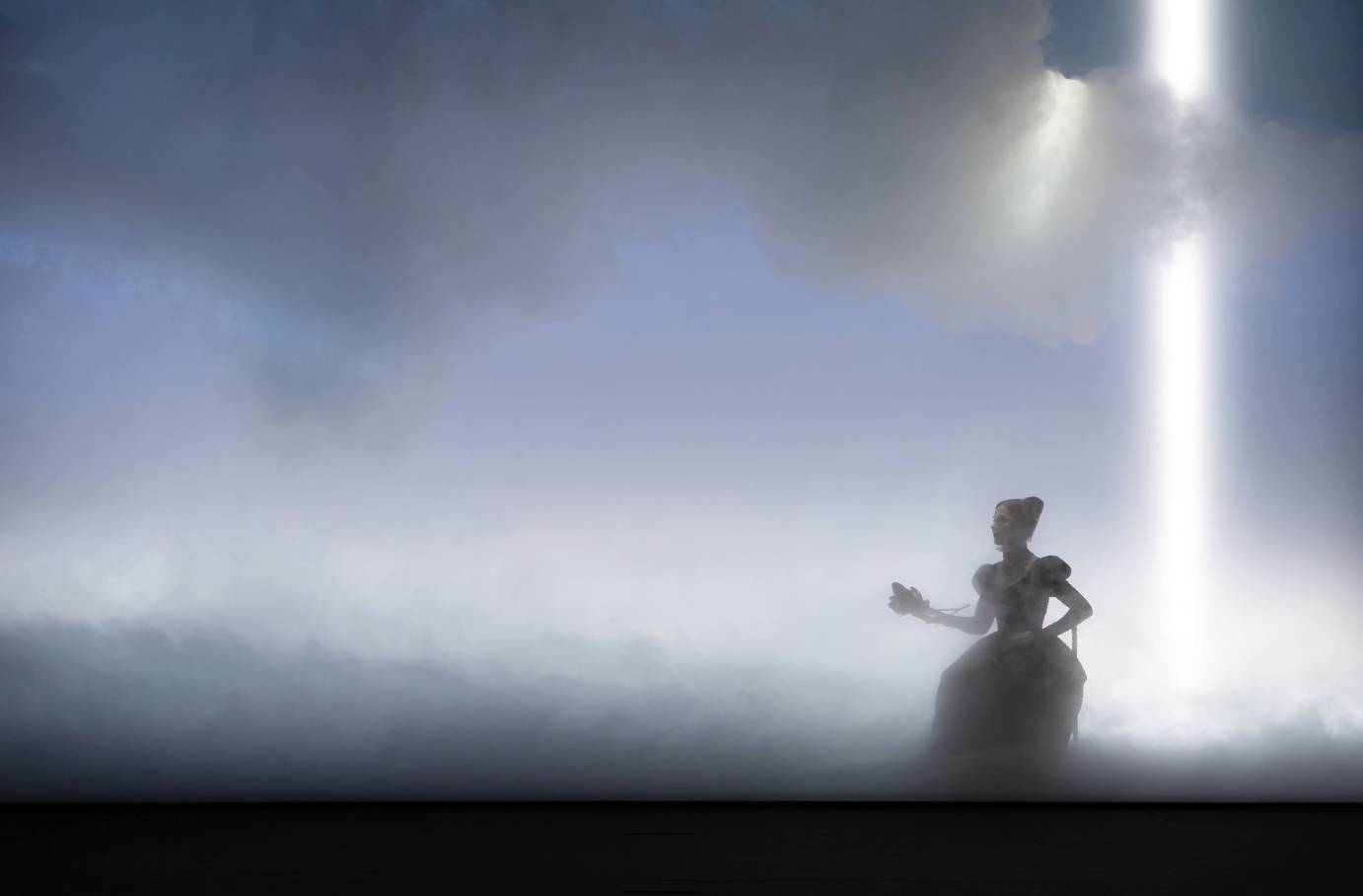 Though this narrative abounds in detail, Wilson sets it in an amorphous, environment where Huppert’s figure in an antique dress resembles a cut-out, silhouetted against a backdrop in pearly tones, or solid teal. Later, Wilson will go for more striking effects, bathing Huppert in a blue light that pools in her shoulder-blades, or turning her face bright green as she opens her mouth to screech silently. In another segment, she sits amid fluffy clouds holding a golden, bird-like object in her hand. The only other props are a white dancing shoe that enters mysteriously on a track, and a blank envelope that disappears down a hole.