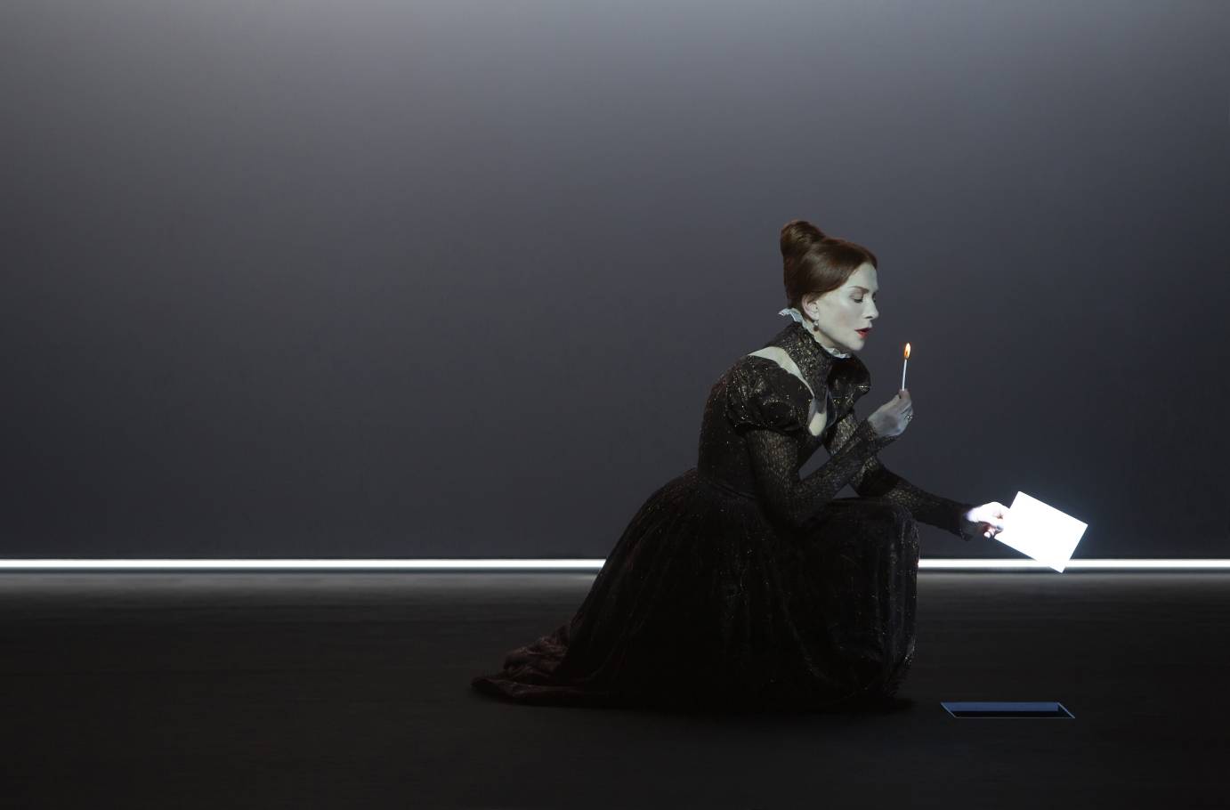 As a royal celebrity, Mary Queen of Scots has much to recommend her to audiences that relish the misfortunes of the rich and famous. A pawn in affairs of state, persecuted by powerful enemies, and with a susceptible heart, Mary cannot enjoy her life of privilege but must pay for it by placing her head on the executioner’s block. This is the stuff of historical romance; and one can easily imagine the story luridly upholstered in a Hollywood pageant. The wonder is that Mary not only survives transplanted to the Minimalist world of Robert Wilson, but that compressed by a severe style her passions seem to redouble and she demands our sympathy.