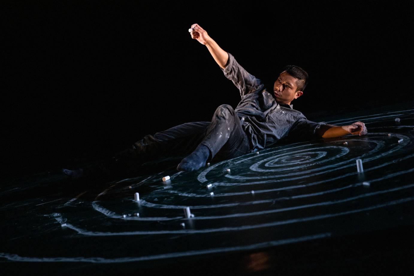Touchdown by Taiwanese scientist-dancer Hao Cheng opens with more projections, this time the atomic theory proposed by Danish physicist Niels Bohr in 1913. Although the projections whiz by too quickly for most to decipher the information, those who paid attention in physics class may recall that electrons orbit a nucleus held in place by electrostatic forces. To illustrate this idea, Cheng dives onto a large, rectangular chalkboard floor strewn with sticks of colorful chalk, which scatter as he slithers, hops, rolls and throws himself about. Tired, his limp hands lose their ability to grasp the chalk, a euphemism for unsolved theory. But a breakthrough comes, and the scientist-dancer picks up a piece of chalk to begin writing theory.