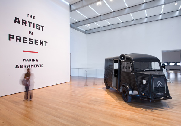 Entrance to the exhibition Marina Abramović: The Artist is Present, The Museum of Modern Art, 2010. Photo by Jason Mandella. In this photo: Marina Abramović and Ulay, Relation in Movement, 1977. Video (black and white, silent), sound environment (2010), Citroën Type H bus, fourteen black-and-white photographs, and megaphone 34:50 min. Musée d’Art Contemporain de Lyon; video and sound environment courtesy the artist and Sean Kelly Gallery. © 2010 Marina amović. Courtesy the artist and Sean Kelly Gallery/Artists Rights Society (ARS), New York |
