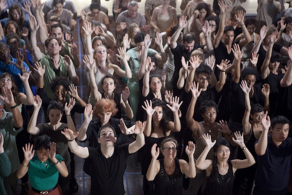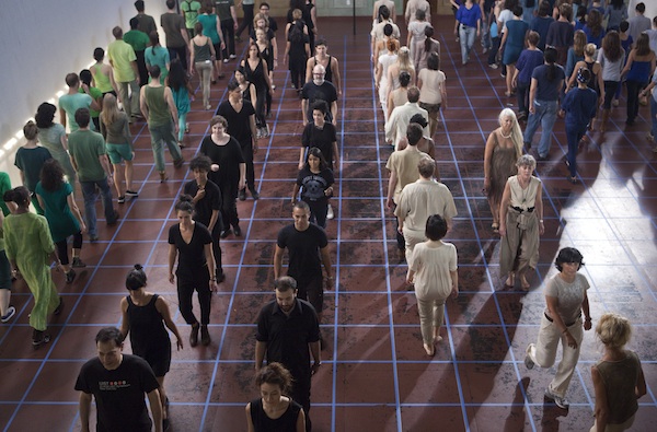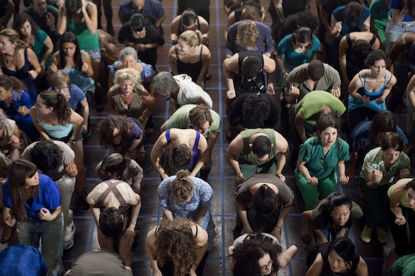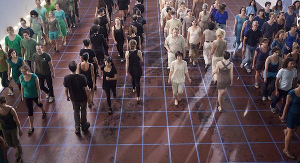 Choreography for Audiences: Take One is a live film and choreographic social experiment in which almost 300 people participate in a series of human games inspired by mathematic systems (think of the games you used to play on the lawn at summer camp, but much more intricate). Our participation in these games generates evolving patterns and formations, similar to a human kaleidoscope, which are captured on film. The succession of the games and ultimately the formations created are based not only on the specific game rules, but also on the individual choices of participants and the intuitive movement of the crowd as a whole. This particular installment included 12 different games, played in a random order.