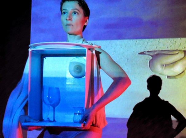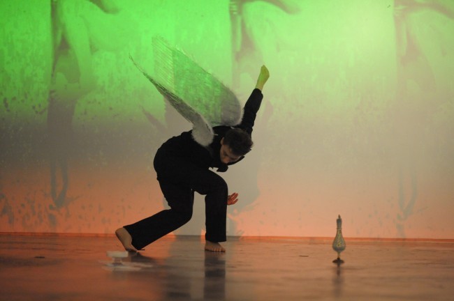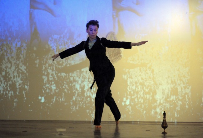 Trifan paints a new picture in each segment of her performance. Her costumes change from floating dress, to jeans, to suit, to glitter jacket, to wings. Her music moves from soundscapes, to text, to what sounds like French cabaret music to tango, and unto more operatic flavors. In the first part of the evening on the blue table cloth she indulges in the pleasures of her laid out table, finally ending it all by scrunching her once beautiful banquet beneath her feet and shuffling it off stage. (All good things must come to an end.) In another section, she dances percussively to insistent drums moving drinking glasses with her toes. In yet another, she performs a ritual, using very specific curved arms and rocking gestures to carefully set out a wine glass and plate. The ritual evolves into a rocking on the knees, which becomes lyrical falling and rebounding with jumps and kicks. In some sections she uses the back wall to slam into or slide down. One of her incarnations, wearing a sparkling silver jacket, appears to be a nightclub nymphet selling herself with sexy shoulder rolls.