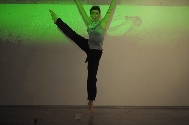 Video projection gently accompanies the dance, saturating the galleries back wall with interpretations of a nude body surrounded by color and floating forms. Presented as an anonymous and androgynous nude in the desert, the projected body is often still or moves ever so slowly.