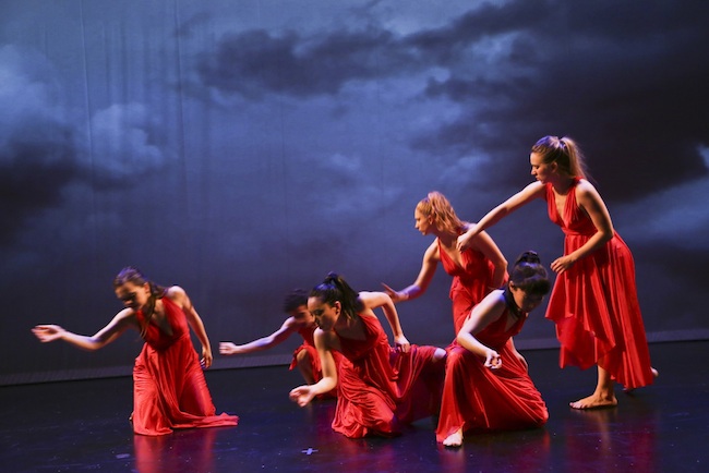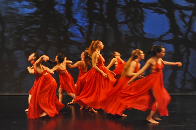 Clad in billowing scarlet costumes, they course onstage one at a time, executing an undulating vocabulary rife with deep knee bends, body rolls that melt across the floor, and rippling arm movements. Katrandjieva, a deft movement maker, manipulates a variety of level changes and striking spatial patterns to keep interest heightened.
