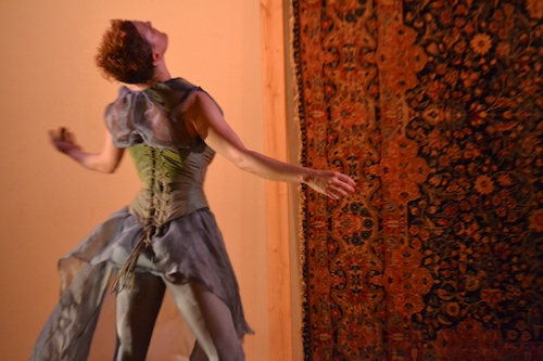 The step down room, according to Kyle’s program notes, was an actual place in his house that one had to pass through to get from one side of the home to another. Filled with shelves of books, a cot, as well as a gold fish bowl, Kyle describes it as a room where he “recalled his imagination taking off.” On stage, Kyle uses Andy Dickerson’s skillful lighting and the clever repositioning of modest set pieces (most distinctly the oriental carpet doubling as a floor piece and curtain) to unveil the poetic properties of his boyhood niche. Each scene shifts the space distinctly. Lori Goldston’s rich cello speaks to some scenes while others are colored by the sonic scapes of James Bigbee Garver. The collaborations are splendid.