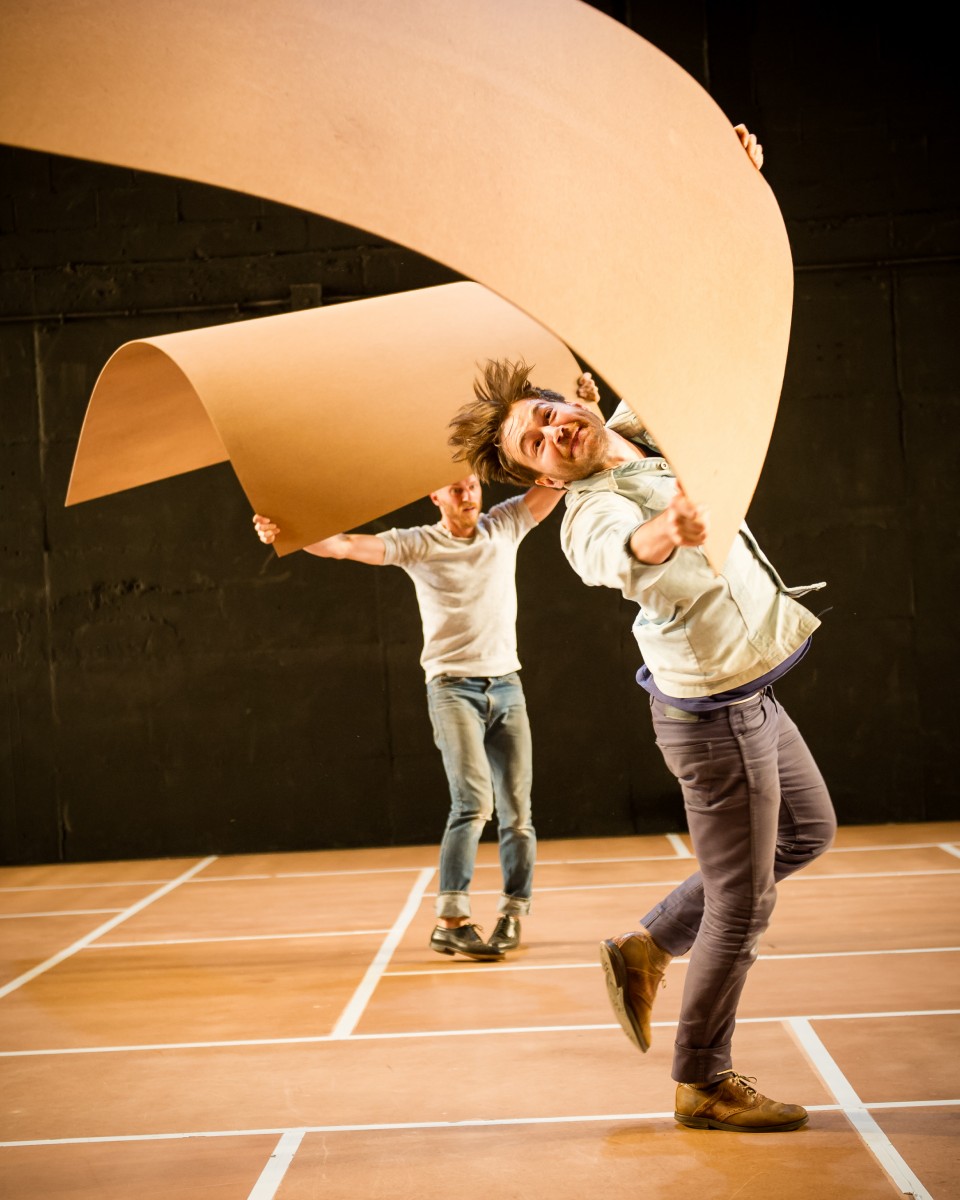 Unconventional use of instruments and other materials are central. In one instance, a male artist performs a solo as his electric guitar hangs down from his side. As he moves, his guitar sways and the instrument hits the his body and the floor, creates an unusual kind of music. At another point, two performers rip panels from the floor and playfully use them to create a series of echoing reverberations. This appears entirely improvised.