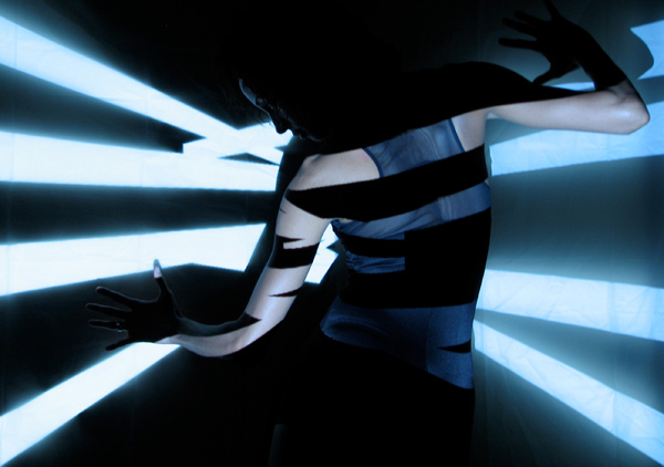 As one section bleeds into another the performers alternate between moving behind the screens where they quickly lose their individuality to become a generic writhing body, or in front of the screens, where they are only lit as per the whim of the computer-generated lines that glide and throb across their squirming torsos, thrust busts, and canted hips.
