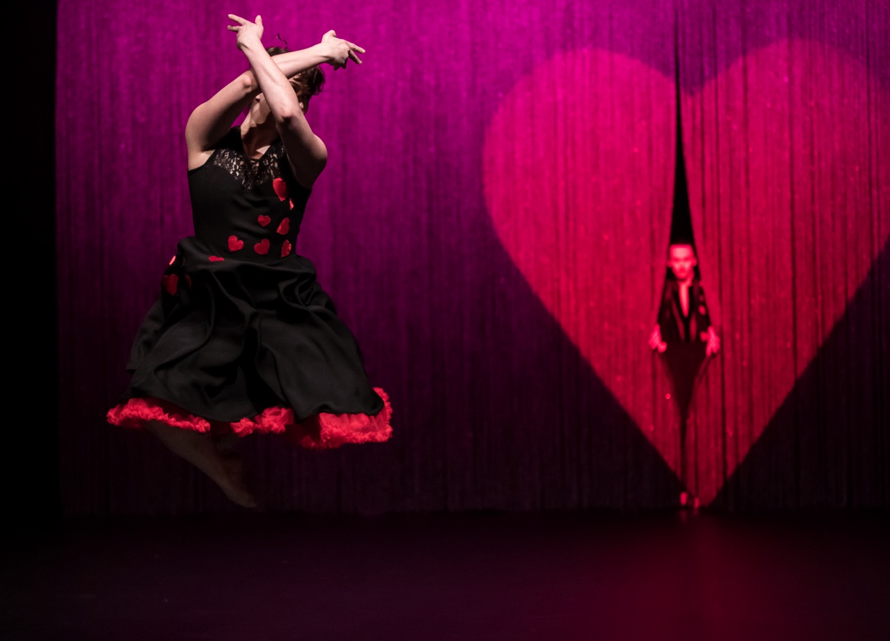 Élodie Cottet bounds through the curtain of silver streamers that pour down across the back of the stage. Her sharply extended legs carve through space, accentuated by a red underskirt that folds and flips in soft flamenco style. Paul Grassin follows, with limbs collapsing and extending in odd and unpredictable ways. It is all light-hearted, buoyant and bounding, like puppy love.