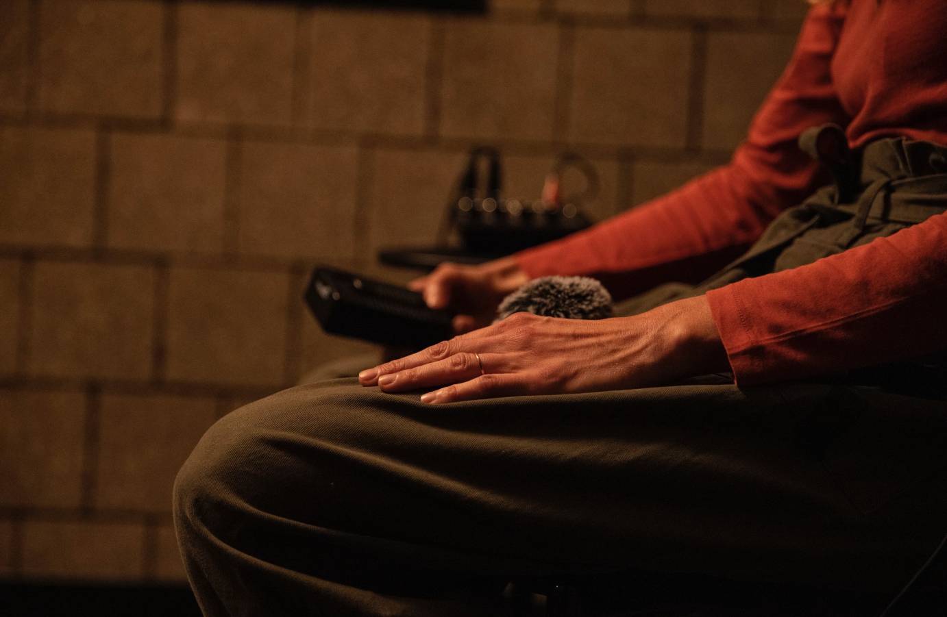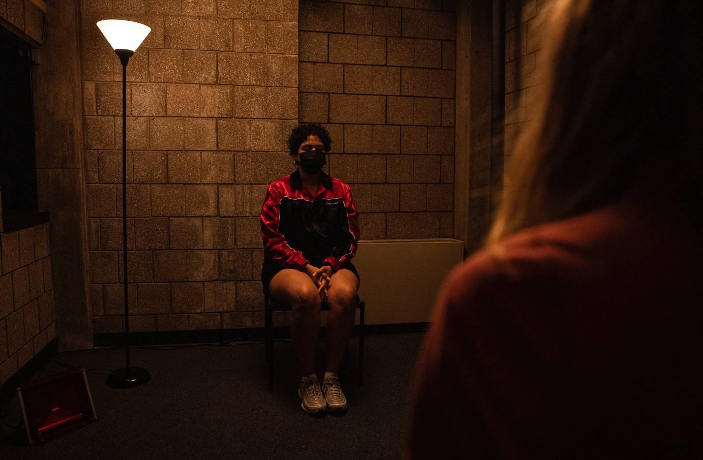 The overhead lights are now so low that I can only see the reflection of her white socks poised as she is seated in her chair. Suddenly a red light on my right fills the room. While I know where I am, this light reminds me of being in my room during quarantine: a safe space for experimentation and creation. We sit here together for a moment in silence. I collect my thoughts in peace.