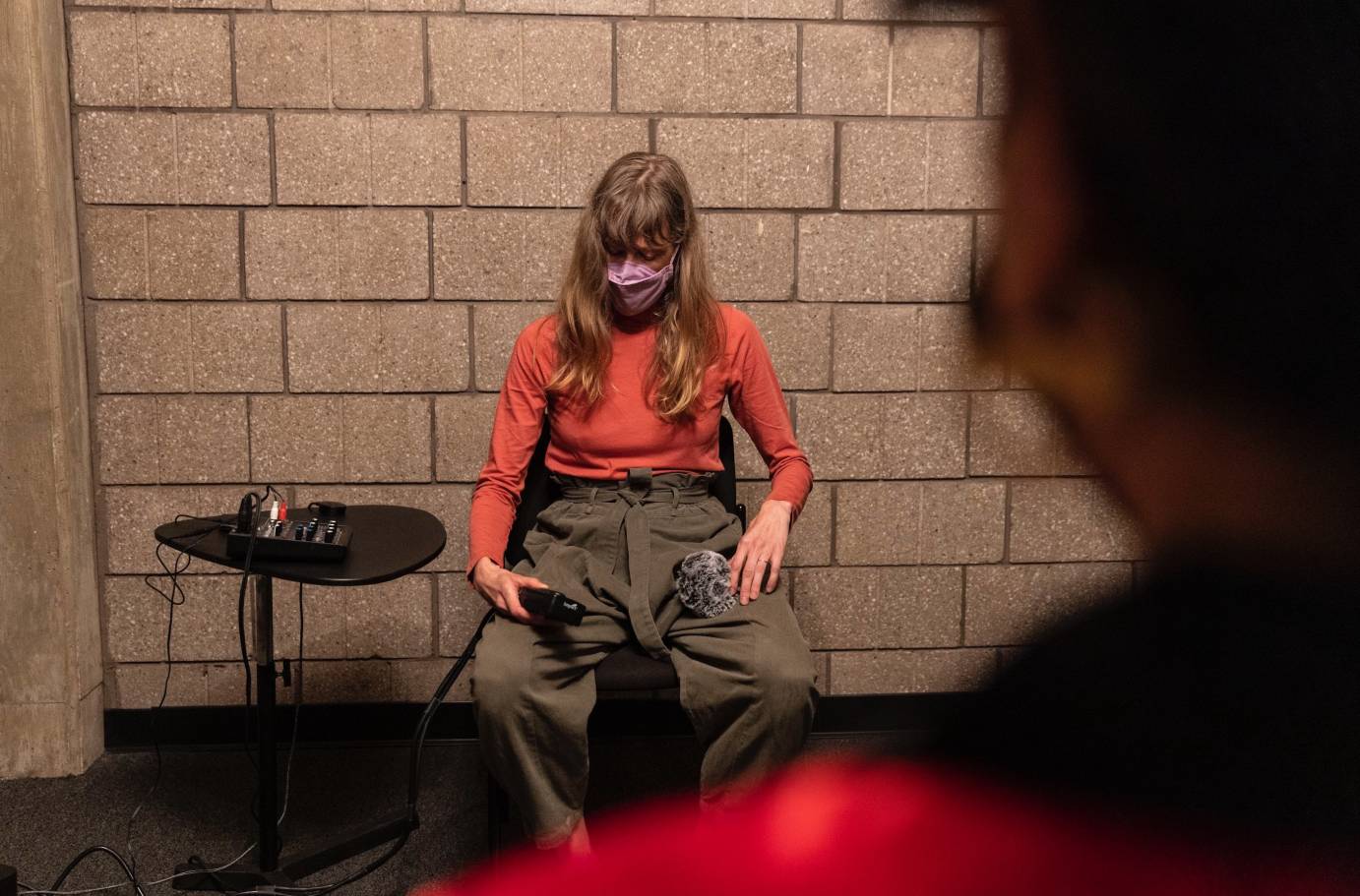She holds a fuzzy microphone in one hand and gently caresses it with the other. I’m instantly transported to the ocean. A sense of calm comes over me as I bask in the sun streaming in from outside. The windows are open, and I can hear the sound of kids playing. Their screams remind me of birds so in my head I call them “bird-kids.” After a moment of listening to the waves, she moves to close the windows. The sun is gone, but the lights in the room are still on.
