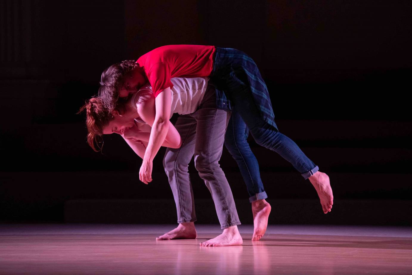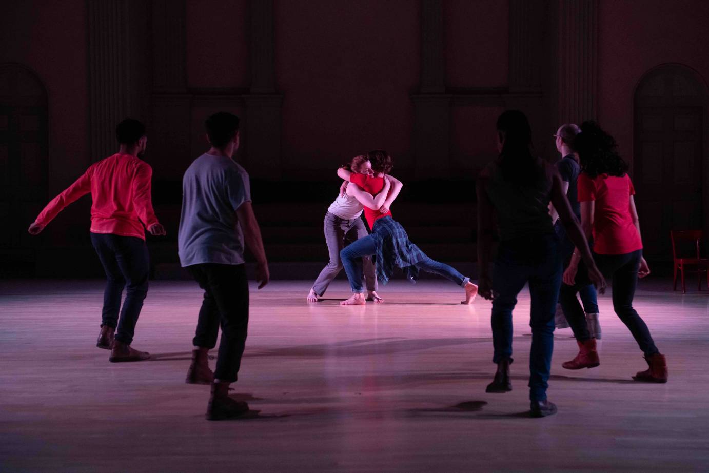 A gaping silence after a cascade of whirling flights fills with the performers’ heaving breath. They root to the spot and nod off; some begin to convulse as the others drift toward them, drawn by their plight. In an intensely affecting expression of the power of touch, they lay healing hands and sing long, wide tones that seem to penetrate their afflicted partners through body and soul. As the shudders calm, they drift apart and away, leaving Johnnie Cruise-Mercer alone in a rectangle of warm light. He paces up and down the space, marking a sequence of steps, measuring, planning, and building to the full-bodied execution of Bernd’s signature virtuosic sequences. Slowly, a tableau of individual scenes emerges around him, each in its own distinct circle or alley of light. Gowin self-administers a sponge bath in a stainless steel basin; Carlson delivers Bernd’s hospital monologue with generous depth of feeling; Raha Behnam boogies across the upstage space; Alex Rodabaugh gently washes Lee’s back in a gesture of intimate care. Each scene reveals a shade of Bernd, just as each indelibly yearns for him. He is gone, but what wealth he has left us.