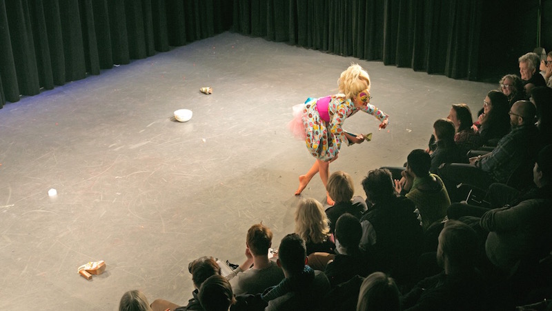 Jody Kuehner, who will make her ADF debut this year, performs the solo one, great, bright, brittle alltogetherness (excerpt) as her alter ego, Cherdonna Shinatra. Shinatra enters the stage with a straight-legged gallop, like a peacock trying to fly by flapping its gangly legs. She is clad in a poufy mini-dress printed with colorful images of donuts, and a platinum-blonde beehive wig the size of a bowling bowl wobbles atop her head.