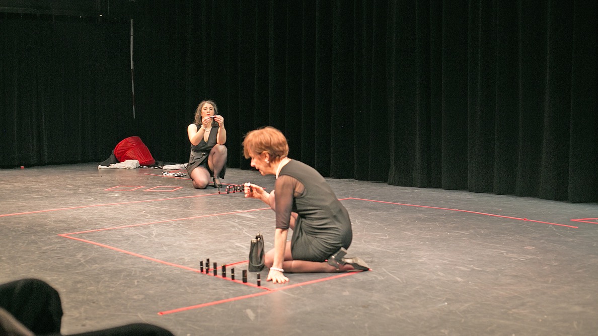 The Lectern plays out like a Saturday Night Live skit. Two women in graduation gowns scramble around the stage and deliver frantic speeches. They speak simultaneously, parodying neurotic elders giving advice to young graduates, like in the opening of The Graduate where Dustin Hoffman is hounded with advice from his parent’s friends.
