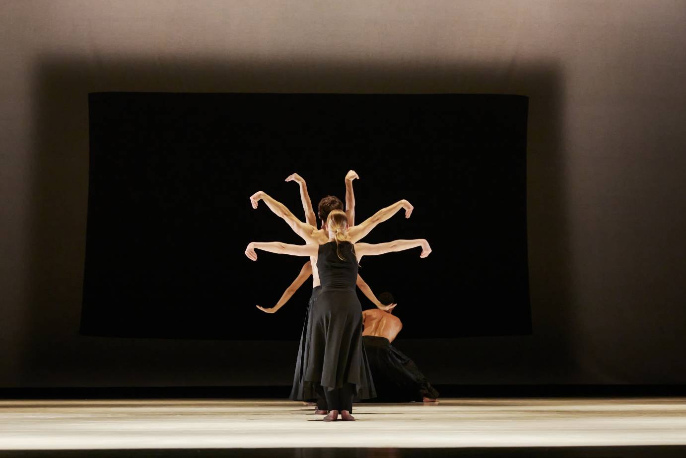 Kaash, by British-Bengali choreographer Khan, bridges the worlds of contemporary dance and the Indian classical form Kathak. Meaning ‘what if’ in Hindi, Kaash draws inspiration from both the creative and destructive powers of the Hindu god Shiva. Kaash’s cast of five dancers are always in motion, traveling in taut geometric patterns that expand and contract across the stage. As the performers continually shift groupings, leaving and joining one another in intricate, rhythmic, and fast-paced choreography, there is always one figure left in serene stillness facing a large black square projected on the upstage wall. This square, designed by visual artist Anish Kapoor, signifies both the beginning of everything and the return to nothing. Dancers pause to contemplate it before returning to the group in choreography that is sometimes aggressive and at others restorative.