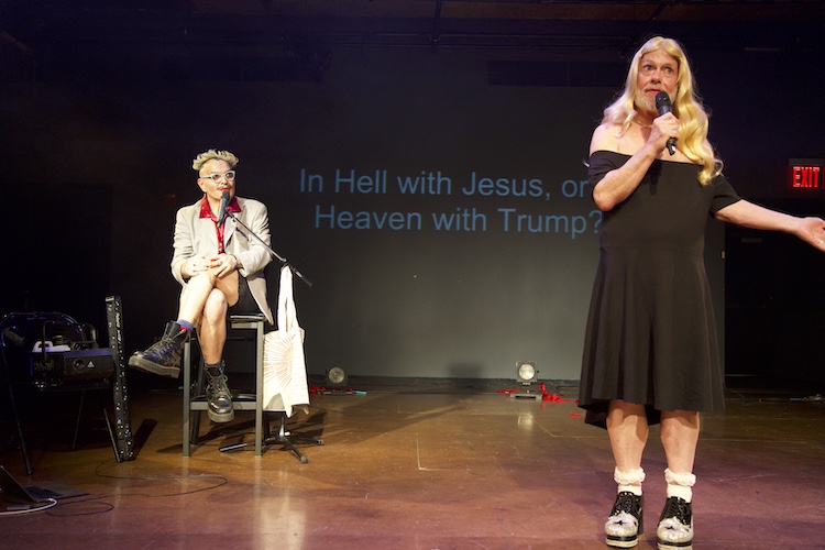 Carrying a small notebook, Dimchev is mild-mannered and reacts with polite interest as we raise our hands to vote, taking the audience’s temperature on matters spiritual and political. “In Hell with Jesus, or in Heaven with Trump?” he inquires innocently. Only once does Dimchev express disbelief at our response. “Liars!” he calls us, relishing our deceit, when, given a choice between “dirty cock, or dirty dishes” the majority profess a fondness for housework. How demure! As Dimchev’s fellow cast member, Xavier Smith, explains, logically we should choose the cock, since it is easier to wash than a stack of plates.