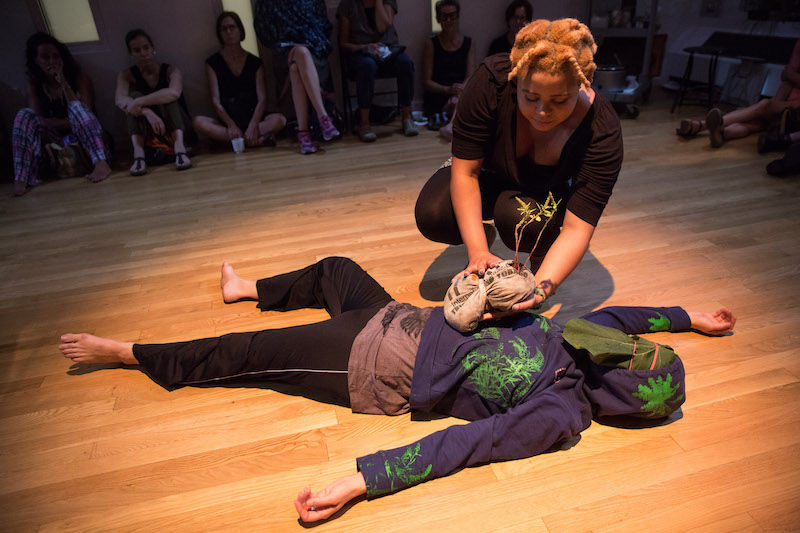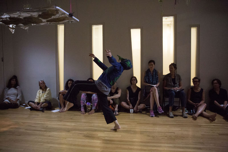 Like life, Sigman’s trajectories are often circular. She zips in rambunctious counterclockwise loops to Kristin Norderval’s eerie chants, which are girded by droning electronica. Several times, she climbs onto her tiptoes, her body listing toward the center of a circle. Toward the end, Sigman lies prone, and Katrina De Wees (a gracious presence) places seedlings wrapped in cloth on her torso and then drizzles water over them. Norderval gives mouth-to-mouth resuscitation by blowing sound into Sigman. Awoken, literally and metaphorically, Sigman removes the leaf from her face and kneels, her journey from life to death back to life seemingly complete.