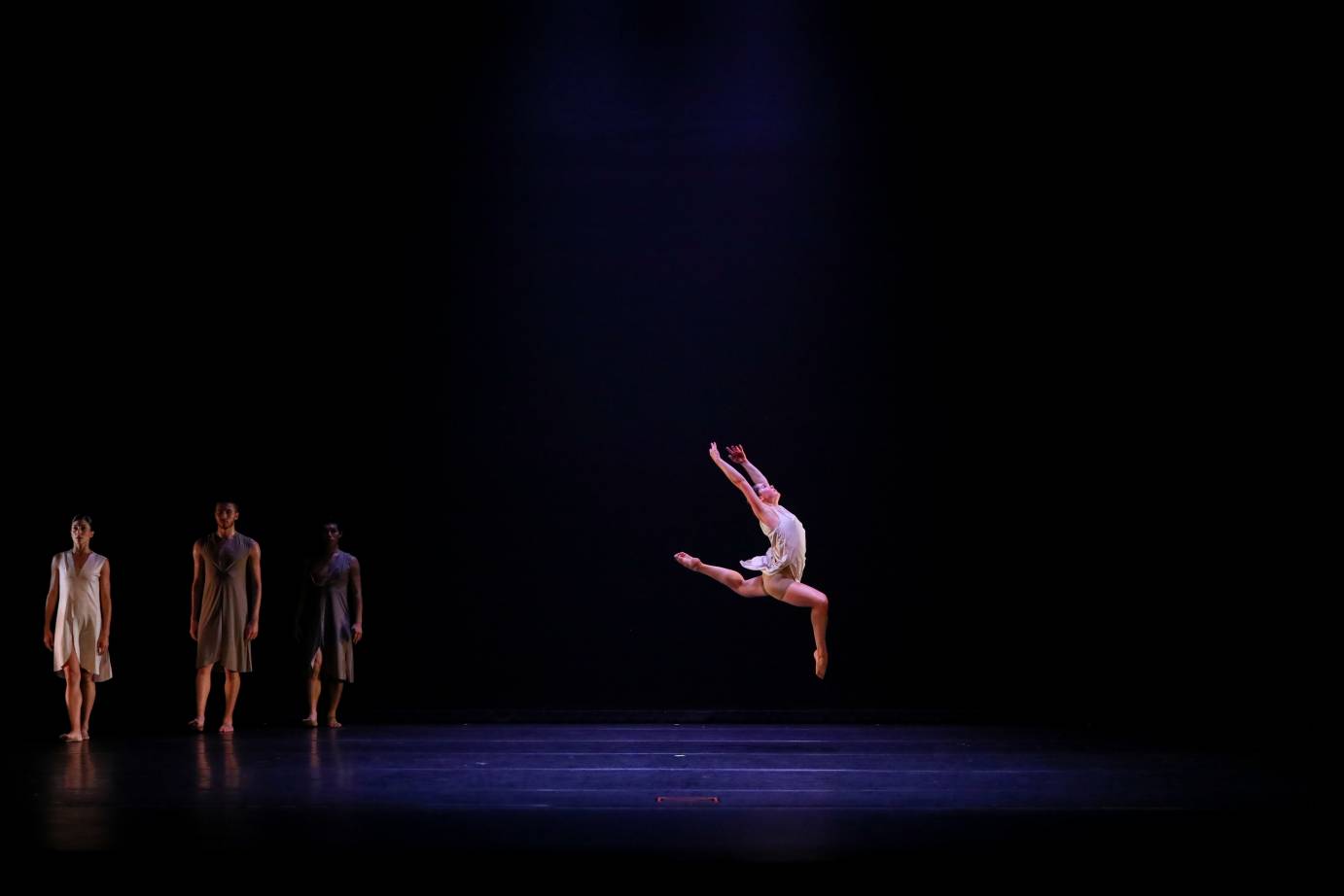 The opening work, Bridge and Tunnel, is a memory capsule of Lehrer’s high school days in Flushing, Queens. The work was created 24years ago during his time as a performer with Gus Giordano Dance Chicago. As the curtains open for the first time, sunshine washes over the dancers, who sport colorful short-sleeved T-shirts and jeans. Tunes by Paul Simon immediately bring us into a space of playfulness, beginning with 50 Ways to Leave Your Lover. Although large jetés and expansive steps travel widely, the most noticeable details appear in the dancers’ faces. Their open chests, wide eyes, and friendly smiles remind us of what it’s like to be a teen again, excited for the world beyond high school. Lehrer’s own high school calculus teacher sat in the audience, giving a cheery wave before the curtain rose.
