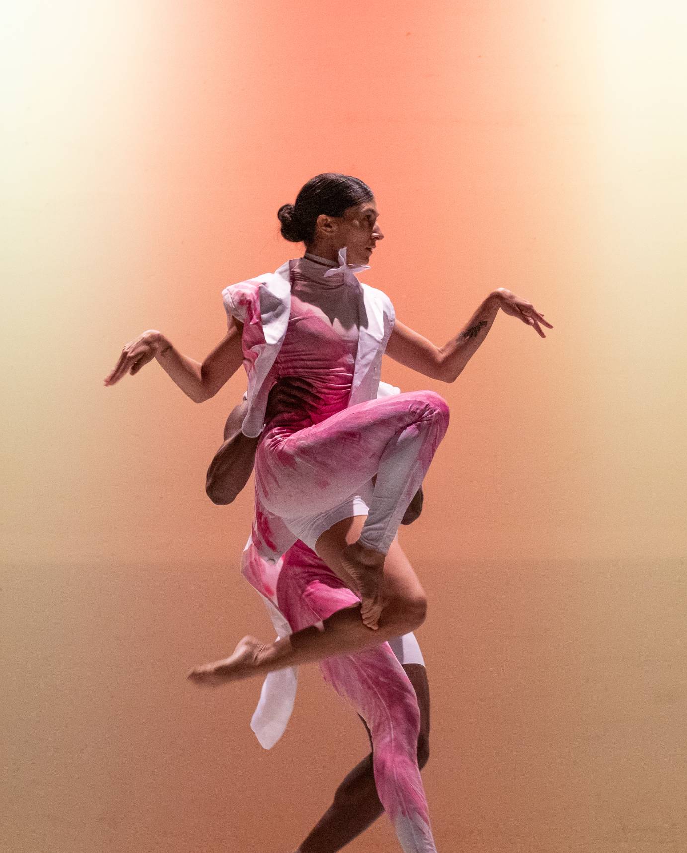Here In This Eden features dancers Ricardo G. Barrett and Leah Suskind, who walk downstage opposite each other in dark brown garments that leave the curvatures of their bodies visible. Sweet and tender, an invisible pull between Barrett and Suskind quickly grows, as do the dreamy long notes of orchestral music by Lisa Gerrard and Pieter Bourke. Whether they’re partnering or dancing side by side in synchronized choreography, the duet expresses the essence of full trust in a relationship. As the sole romantic work of the evening, the love letter Here In This Eden is harmoniously charismatic and gentle.