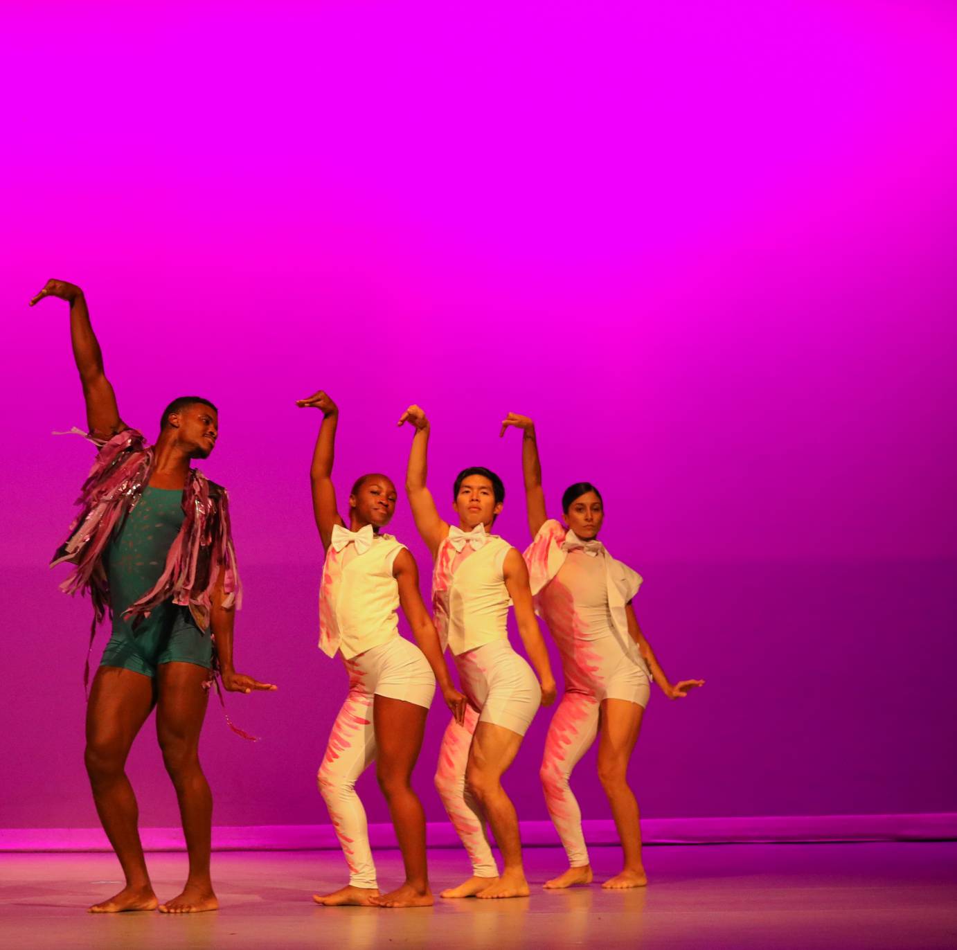 Two full-company works follow, mixing comedic joy and laughter into the evening. La Follia, originally created during a choreographic residency at University of Tampa, is a classical, poised work set to Vivaldi. Dressed in black and maroon, the dancers are carried by melodic rhythms to pull the audience into a composed, collected world. Next up, Lehrer transports the audience to a Las Vegas revue in mingos!, which brings flamingos to vibrant life—flamingos that eventually transform into peacocks. Adventurous and sassy, the birds love to show off, which inevitably leads to comical quarrels and entanglements.