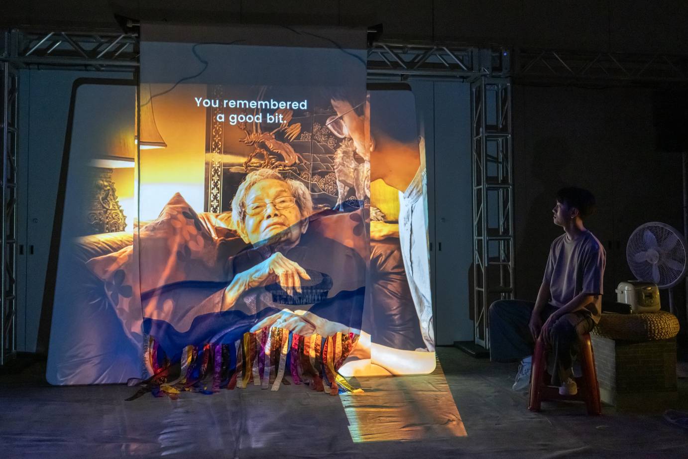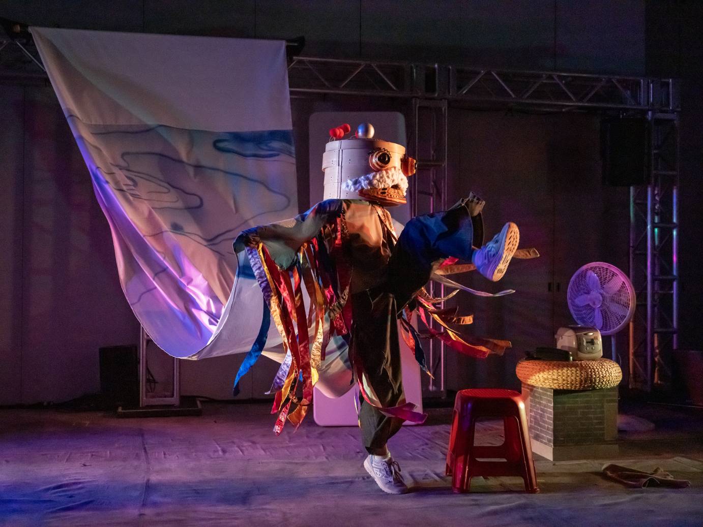 Random objects scattered across the stage — a stool, a telephone, a crockpot, an apple, and a compilation of bamboo steamer baskets adorned with a red-and-gold face and wire pom-poms — immediately spark curiosity. At center stage, colorful fabrics drape down from a screen.