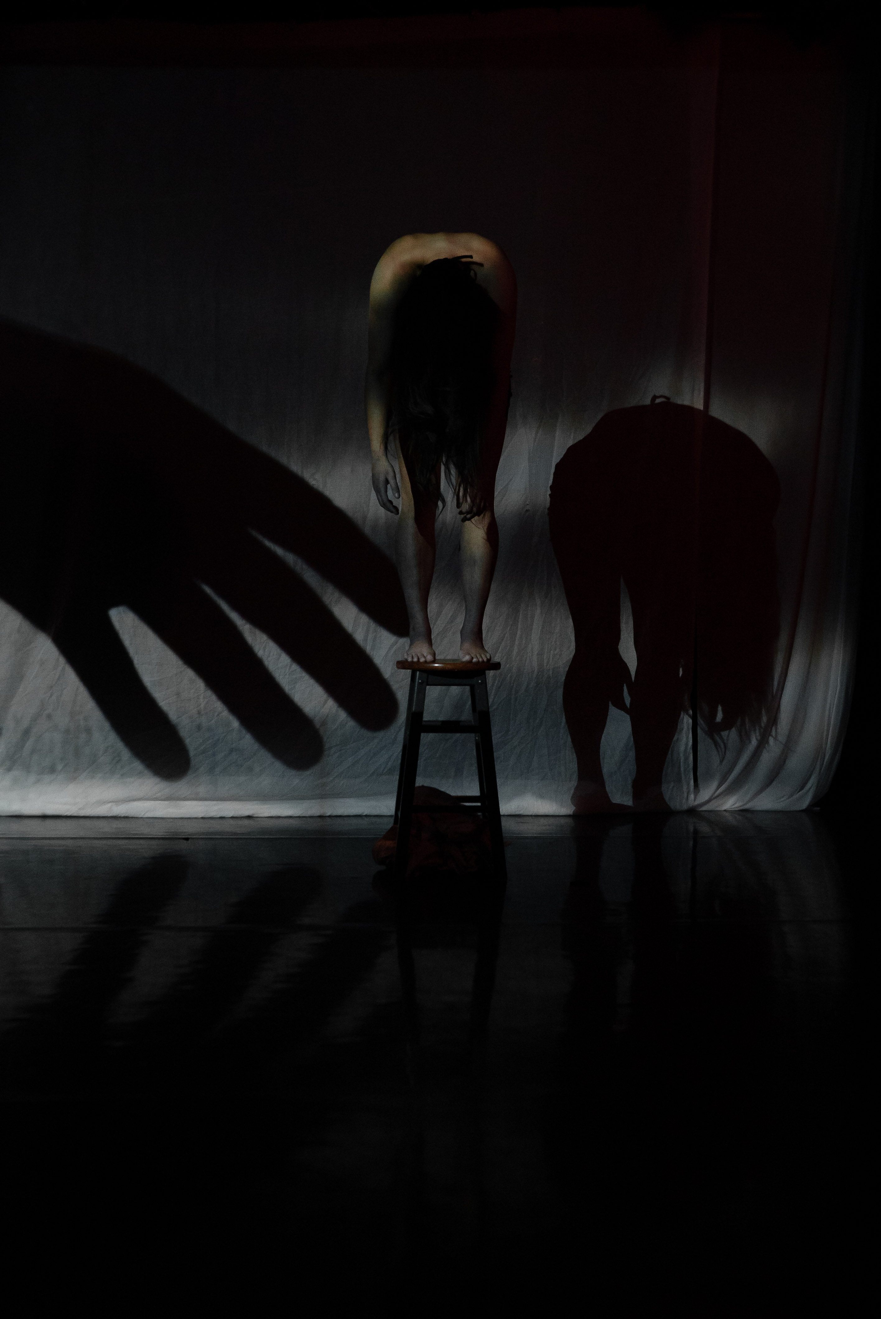 Tanabe’s supernatural transformation unfolds against the echoing dissonances of Patrick Shiroshi’s score and the hypnotic play of light and shadow of projected silhouettes—hair, hands, face, and torso floating in gravityless slow motion. In Japanese folklore, the yūrei is distinguished by pale, limp hands and long, dark hair that covers her face. Stripped of her white shirt and pants, Tanabe kneels atop a tall stool, rising slowly to stand and descend to the floor, all the while doubled over with her loose hair obscuring her face. Gone are the harmonious geometries of her “polite dance,” her limbs dangling and twitching into distorted angles, fingers and toes gnarled as she creeps blindly around the stage with delicate precarity and ominous weight, all the while seeking something unspeakable in the darkness.
