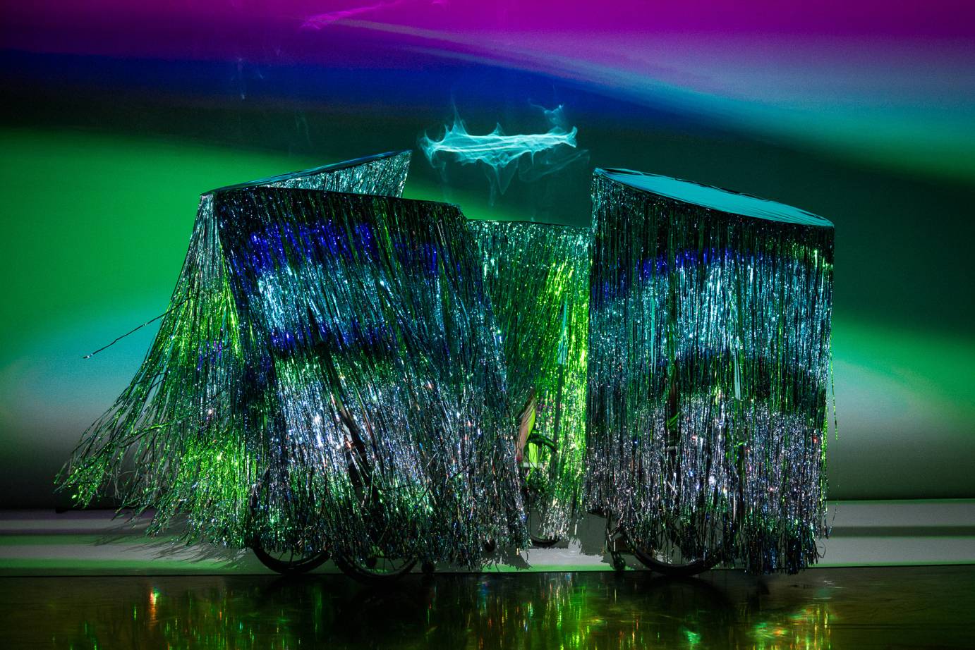 The performers have disappeared into the silver towers which now wriggle, bounce, swirl, and shimmy — a flurry of fringe, feet, wheels, and mystery. The background swirls in purple, blue, and green. Photo: Cherylynn Tsushima