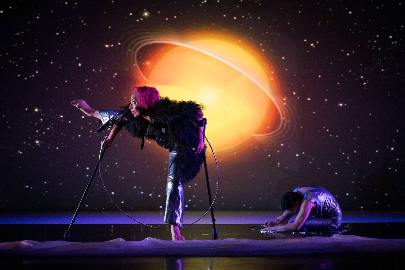 Alice Sheppard leans on her crutches as she balances on one bent leg while lifting the other high. She leans forward, also balancing a silver hoop on her neck and shoulders, as she looks in the direction of the lifted leg, a mischievous expression on her face. Alice is a multiracial Black woman with magenta curly hair; she wears silver pants and a dramatic vest of black feathers. Behind her, Tatiana Cholewa sits on the floor in a silver hoop, bending at the waist and folding their body in half. Tati is a white person with very short hair, they wear a silver sleeveless pantsuit. Behind them both is a large flowing orange planet in a starry sky.