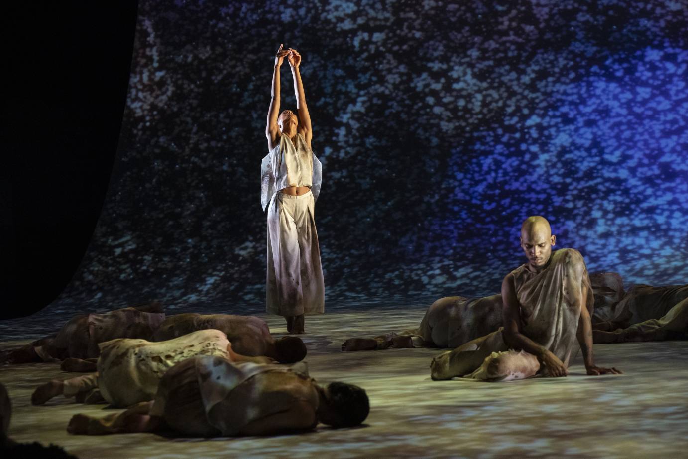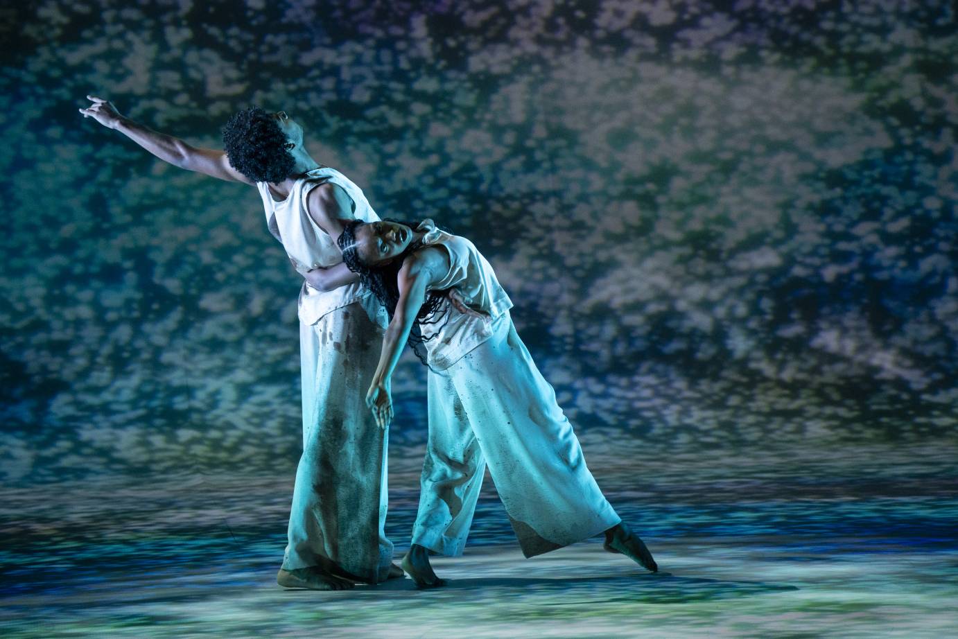 This impatience with the “beautiful” haunted me as I witnessed and absorbed Abraham’s creation, which, beyond the prayerful plea of its title, is almost paralyzingly beautiful. The work’s movement, music, and design are of a piece: quietly articulate dancing by Abraham and a strong ensemble twines organically with a delicately lush live score by chamber group yMusic; a shifting mosaic of pointillist video projections by Cao Yuxi (JAMES) floods the stage with color, mood, and imagery, absorbed and reflected by Karen Young’s diaphanous costumes that glow in Dan Scully’s sensitive lighting. A deluge of “beautiful,” thoughtfully composed and rendered— the real world feels shockingly bleak after 70 minutes enveloped and submerged in so much “beautiful.”