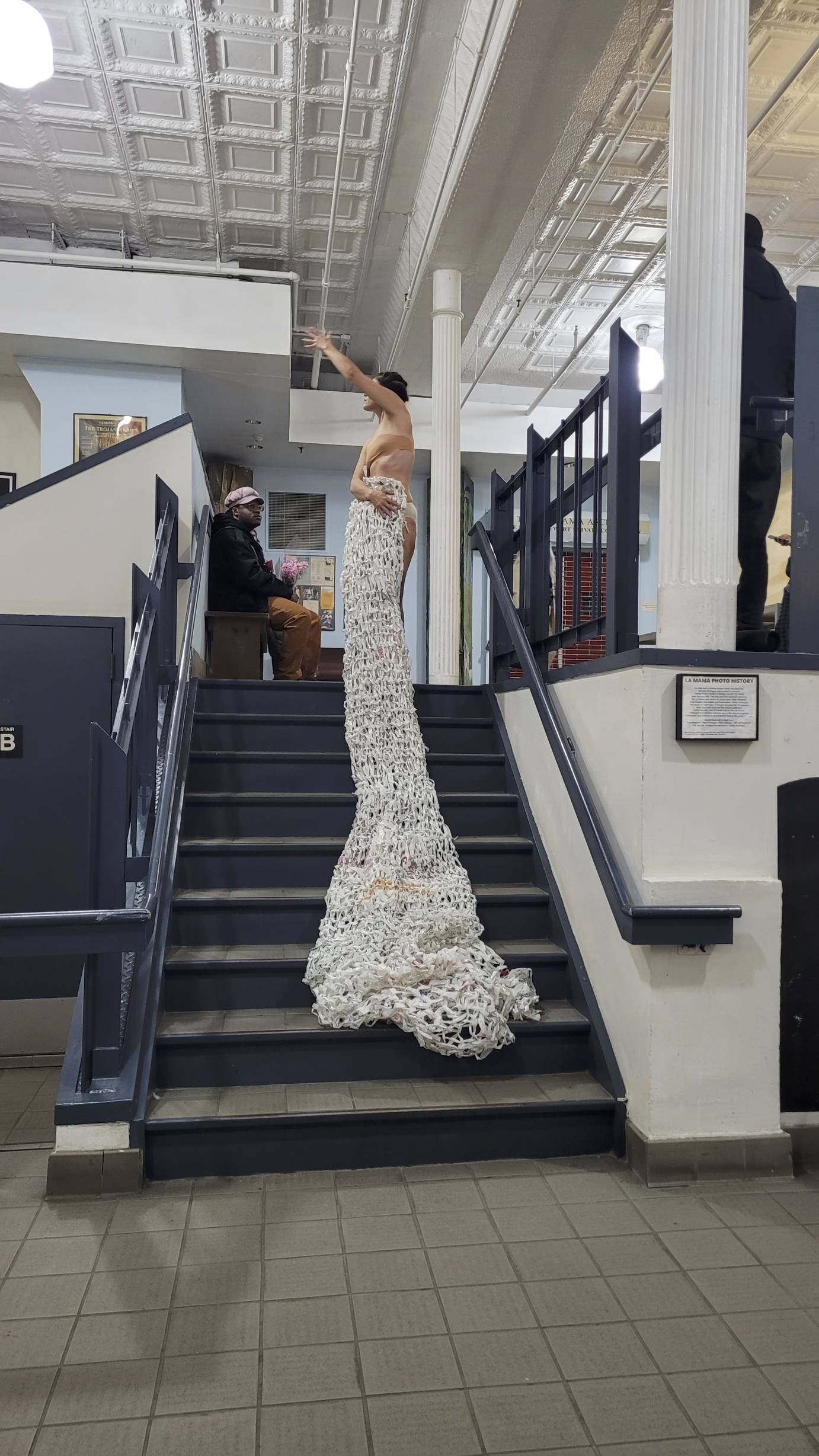 Seattle-based Chilean artist Carolina Marin opens the program moving inside a long, voluminous meshed tube called an Arrurrú (which also serves as the title of the work.) Made of what looks like torn-up plastic bag remnants, the contraption’s elasticity allows the dancer ample non-restricted movement. The program explains Arrurrú as a performative wearable device, designed to be and inhabit, whose main characteristic is to contain and provide security. Marin’s grace, and the meditative ease with which she moves the apparatus, make the work transcend the prosaic setting. Arrurrú, subtitled surviving to change skin, becomes a malleable sculpture, dance partner, and home.