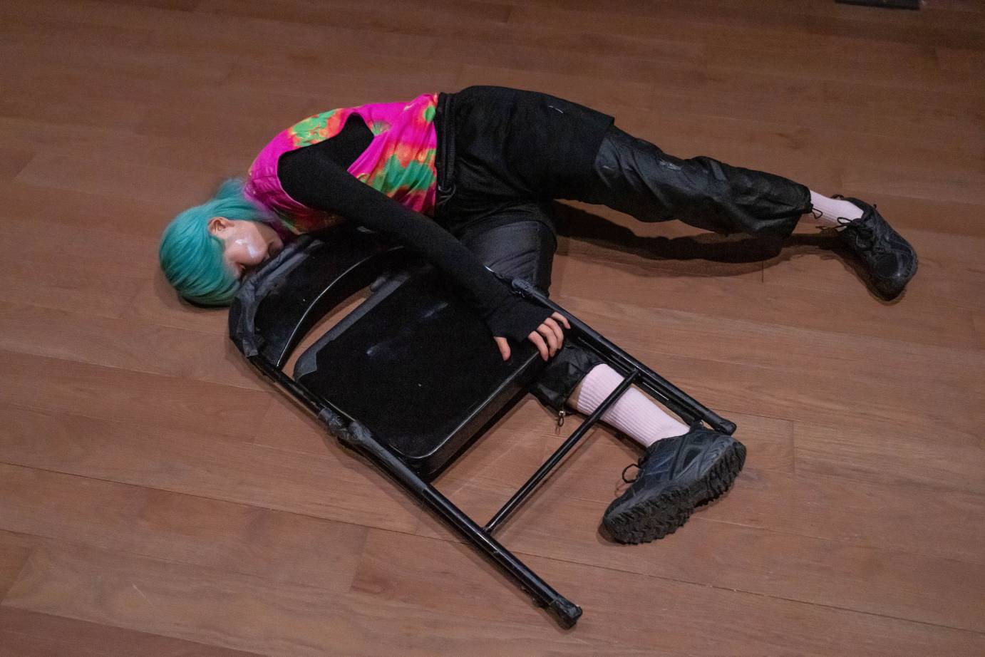 A particularly striking moment arrives when Nishimura ascends the central ladder, and presses her mouth to the microphone. She crinkles a bag of a dried snacks, and begins to chew. The sound, amplified and intimate, carries a strange sensuality. Crumbs scatter across the floor, heightening the sense of frenzy.