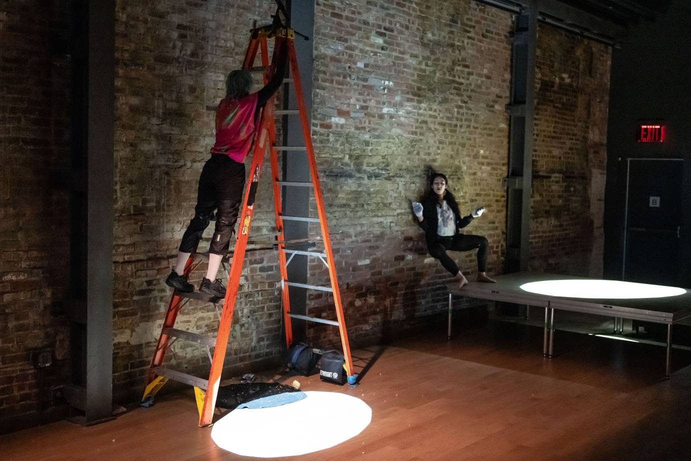 Jesi Cook's trio Wedge, a whirlwind of structured improvisation, emerges from the shadows. It opens in near darkness, with quiet, slithering movements. A bright spotlight suddenly flares across the back wall and trickles downward, revealing Mina Nishimura. Cook stands poised on the far ladder, while Ayano Elson enters last. At first, the performers seem isolated — each existing in their own world — until breath and rhythmic pulses slowly draw them into sync.