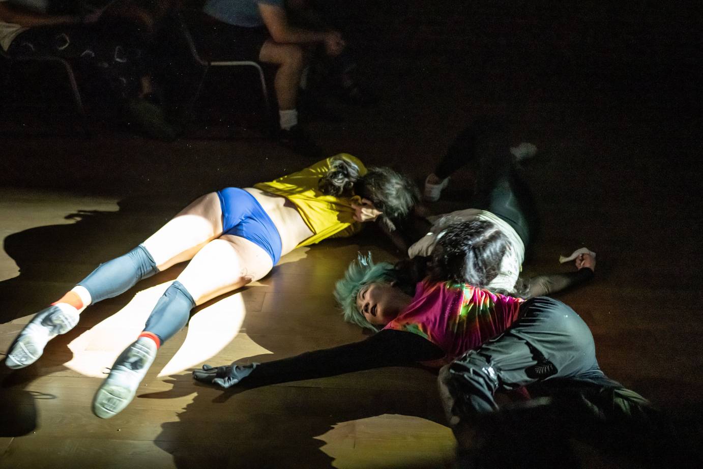 As the lights brighten, their movement intensifies: crawling, writhing, then stomping and pressing into one another’s bodies. I grow captivated by how they weave and dart through the space. They climb onto the table, stamping their feet with clarity and force.